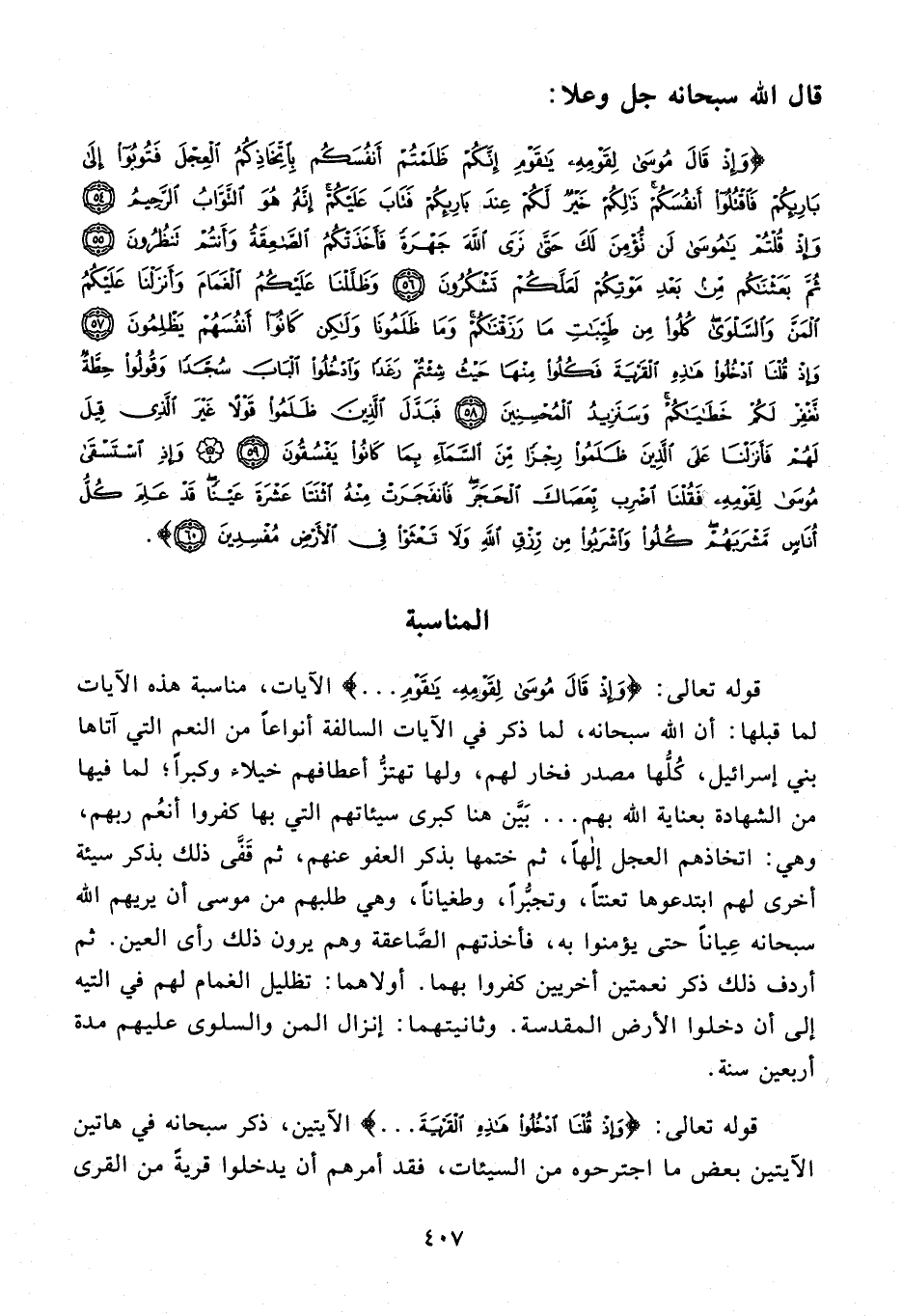{وَإِذْ قالَ مُوسى لِقَوْمِهِ يا قَوْمِ إِنَّكُمْ ظَلَمْتُمْ أَنْفُسَكُمْ بِاتِّخاذِكُمُ الْعِجْلَ فَتُوبُوا إِلى بارِئِكُمْ فَاقْتُلُوا أَنْفُسَكُمْ ذلِكُمْ خَيْرٌ لَكُمْ عِنْدَ بارِئِكُمْ فَتابَ عَلَيْكُمْ إِنَّهُ هُوَ التَّوَّابُ الرَّحِيمُ (54) وَإِذْ قُلْتُمْ يا مُوسى لَنْ نُؤْمِنَ لَكَ حَتَّى نَرَى اللَّهَ جَهْرَةً فَأَخَذَتْكُمُ الصَّاعِقَةُ وَأَنْتُمْ تَنْظُرُونَ (55) ثُمَّ بَعَثْناكُمْ مِنْ بَعْدِ مَوْتِكُمْ لَعَلَّكُمْ تَشْكُرُونَ (56) وَظَلَّلْنا عَلَيْكُمُ الْغَمامَ وَأَنْزَلْنا عَلَيْكُمُ الْمَنَّ وَالسَّلْوى كُلُوا مِنْ طَيِّباتِ ما رَزَقْناكُمْ وَما ظَلَمُونا وَلكِنْ كانُوا أَنْفُسَهُمْ يَظْلِمُونَ (57) وَإِذْ قُلْنَا ادْخُلُوا هذِهِ الْقَرْيَةَ فَكُلُوا مِنْها حَيْثُ شِئْتُمْ رَغَدًا وَادْخُلُوا الْبابَ سُجَّدًا وَقُولُوا حِطَّةٌ نَغْفِرْ لَكُمْ خَطاياكُمْ وَسَنَزِيدُ الْمُحْسِنِينَ (58) فَبَدَّلَ الَّذِينَ ظَلَمُوا قَوْلًا غَيْرَ الَّذِي قِيلَ لَهُمْ فَأَنْزَلْنا عَلَى الَّذِينَ ظَلَمُوا رِجْزًا مِنَ السَّماءِ بِما كانُوا يَفْسُقُونَ (59) وَإِذِ اسْتَسْقى مُوسى لِقَوْمِهِ فَقُلْنَا اضْرِبْ بِعَصاكَ الْحَجَرَ فَانْفَجَرَتْ مِنْهُ اثْنَتا عَشْرَةَ عَيْنًا قَدْ عَلِمَ كُلُّ أُناسٍ مَشْرَبَهُمْ كُلُوا وَاشْرَبُوا مِنْ رِزْقِ اللَّهِ وَلا تَعْثَوْا فِي الْأَرْضِ مُفْسِدِينَ (60)}.