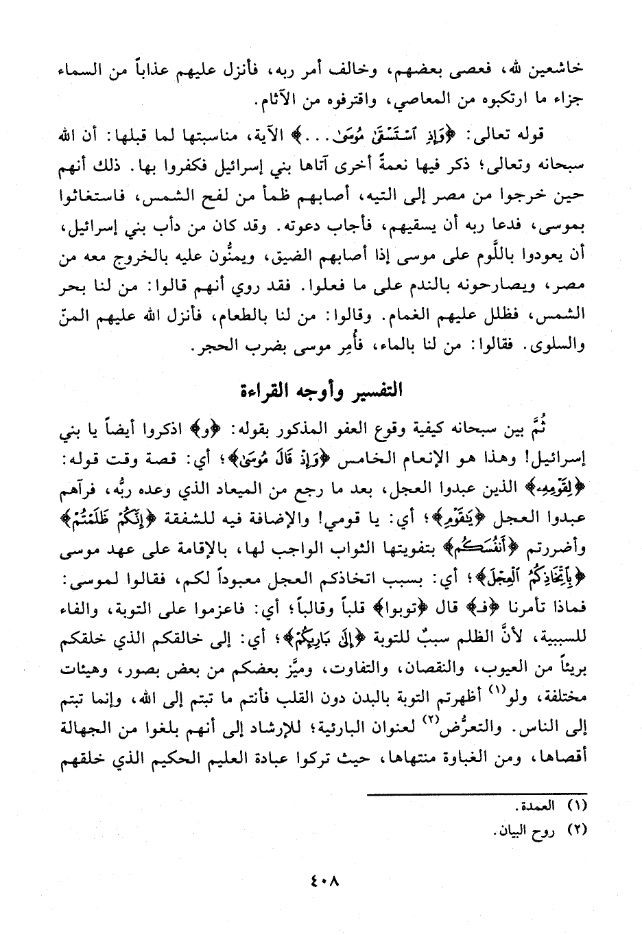 قوله تعالى: {وَإِذِ اسْتَسْقى مُوسى ...} الآية، مناسبتها لما قبلها: أن الله سبحانه وتعالى؛ ذكر فيها نعمة أخرى آتاها بني إسرائيل فكفروا بها. ذلك أنهم حين خرجوا من مصر إلى التيه، أصابهم ظمأ من لفح الشمس، فاستغاثوا بموسى، فدعا ربه أن يسقيهم، فأجاب دعوته. وقد كان من دأب بني إسرائيل، أن يعودوا باللّوم على موسى إذا أصابهم الضيق، ويمنّون عليه بالخروج معه من مصر، ويصارحونه بالندم على ما فعلوا. فقد روي أنهم قالوا: من لنا بحر الشمس، فظلل عليهم الغمام. وقالوا: من لنا بالطعام، فأنزل الله عليهم المنّ والسلوى. فقالوا: من لنا بالماء، فأمر موسى بضرب الحجر.