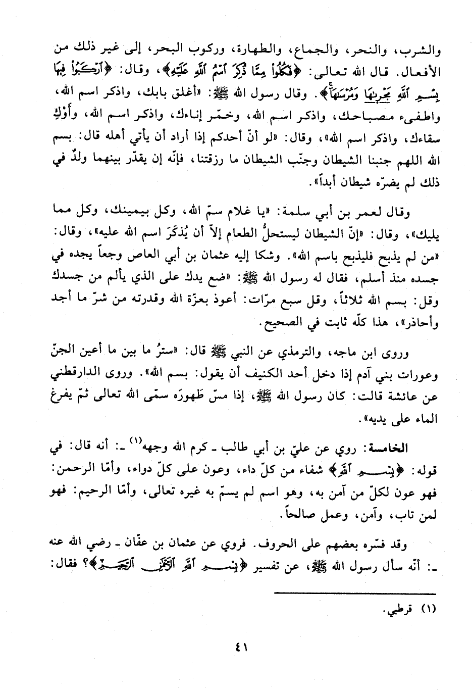 «من لم يذبح باسم الله». وشكا إليه عثمان بن أبي العاص وجعا يجده في جسده منذ أسلم، فقال له رسول الله صلّى الله عليه وسلّم: «ضع يدك على الذي يألم من جسدك وقل: بسم الله ثلاثا، وقل سبع مرّات: أعوذ بعزّة الله وقدرته من شرّ ما أجد وأحاذر»، هذا كلّه ثابت في الصحيح.