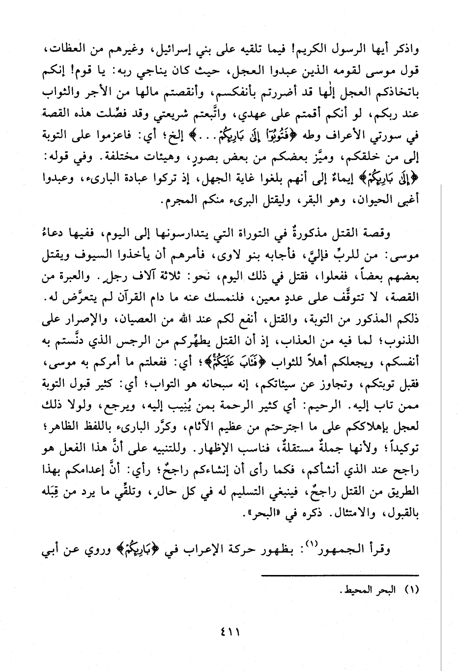 وقرأ الجمهور (¬1): بظهور حركة الإعراب في {بارِئِكُمْ} وروي عن أبي