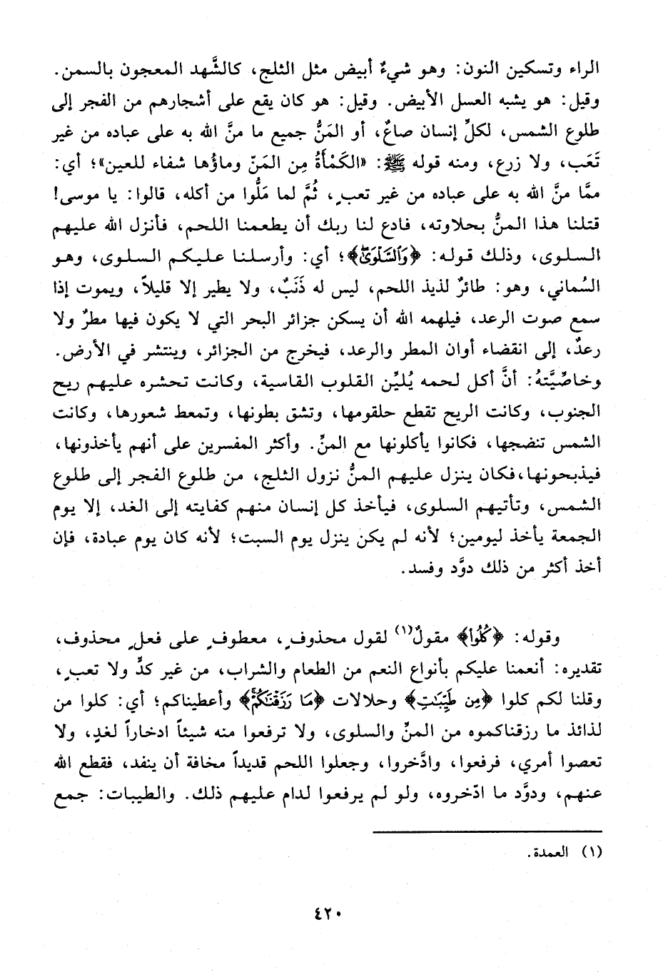 الراء وتسكين النون: وهو شيء أبيض مثل الثلج، كالشّهد المعجون بالسمن. وقيل: هو يشبه العسل الأبيض. وقيل: هو كان يقع على أشجارهم من الفجر إلى طلوع الشمس، لكلّ إنسان صاع، أو المنّ جميع ما منّ الله به على عباده من غير تعب، ولا زرع، ومنه قوله صلّى الله عليه وسلّم: «الكمأة من المنّ وماؤها شفاء للعين»؛ أي: ممّا منّ الله به على عباده من غير تعب، ثمّ لما ملّوا من أكله، قالوا: يا موسى! قتلنا هذا المنّ بحلاوته، فادع لنا ربك أن يطعمنا اللحم، فأنزل الله عليهم السلوى، وذلك قوله: {وَالسَّلْوى}؛ أي: وأرسلنا عليكم السلوى، وهو السماني، وهو: طائر لذيذ اللحم، ليس له ذنب، ولا يطير إلا قليلا، ويموت إذا سمع صوت الرعد، فيلهمه الله أن يسكن جزائر البحر التي لا يكون فيها مطر ولا رعد، إلى انقضاء أوان المطر والرعد، فيخرج من الجزائر، وينتشر في الأرض.