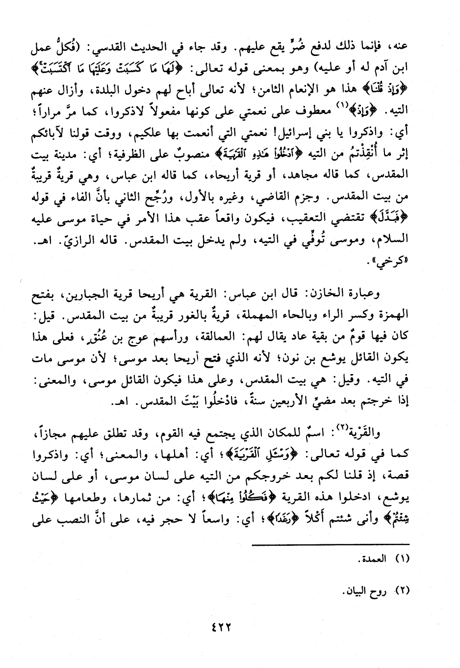 وعبارة الخازن: قال ابن عباس: القرية هي أريحا قرية الجبارين، بفتح الهمزة وكسر الراء وبالحاء المهملة، قرية بالغور قريبة من بيت المقدس. قيل: كان فيها قوم من بقية عاد يقال لهم: العمالقة، ورأسهم عوج بن عنق، فعلى هذا يكون القائل يوشع بن نون؛ لأنه الذي فتح أريحا بعد موسى؛ لأن موسى مات في التيه. وقيل: هي بيت المقدس، وعلى هذا فيكون القائل موسى، والمعنى: إذا خرجتم بعد مضيّ الأربعين سنة، فادخلوا بيت المقدس. اه.