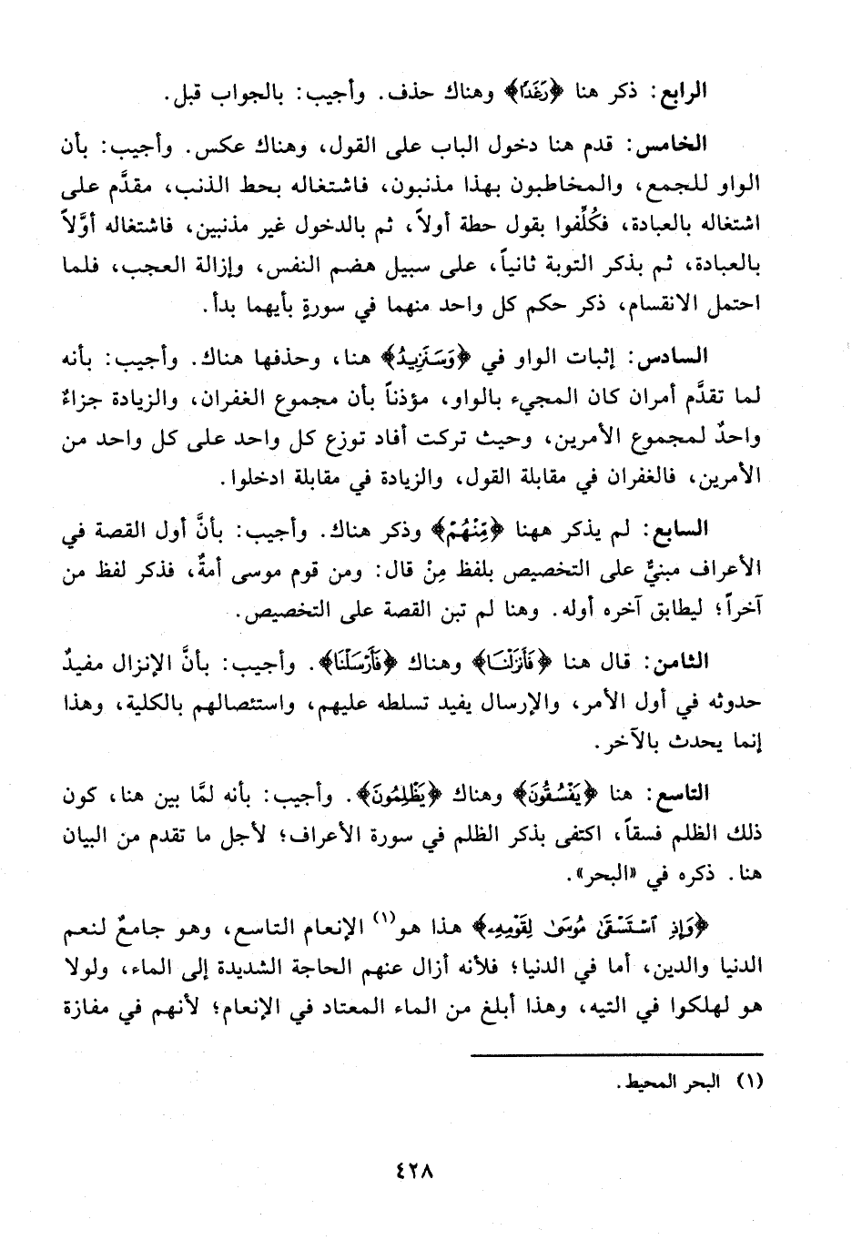 السابع: لم يذكر ههنا {منهم} وذكر هناك. وأجيب: بأنّ أول القصة في الأعراف مبنيّ على التخصيص بلفظ من قال: ومن قوم موسى أمة، فذكر لفظ من آخرا؛ ليطابق آخره أوله. وهنا لم تبن القصة على التخصيص.
