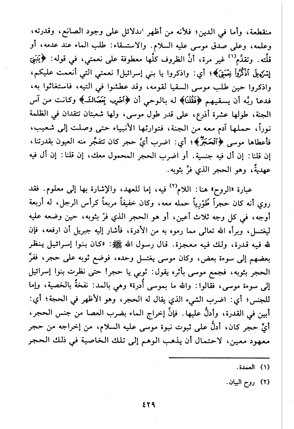 عبارة «الروح» هنا: اللام (¬2) فيه، إما للعهد، والإشارة بها إلى معلوم. فقد روي أنه كان حجرا طوريا حمله معه، وكان خفيفا مربعا كرأس الرجل، له أربعة أوجه، في كل وجه ثلاث أعين، أو هو الحجر الذي فرّ بثوبه، حين وضعه عليه ليغتسل، وبرأه الله تعالى مما رموه به من الأدرة، فأشار إليه جبريل أن ارفعه، فإن لله فيه قدرة، ولك فيه معجزة. قال رسول الله صلّى الله عليه وسلّم: «كان بنوا إسرائيل ينظر بعضهم إلى سوءة بعض، وكان موسى يغتسل وحده، فوضع ثوبه على حجر، ففرّ الحجر بثوبه، فجمع موسى بأثره يقول: ثوبي يا حجر! حتى نظرت بنوا إسرائيل إلى سوءة موسى، فقالوا: والله ما بموسى أدرة» وهي بالمد: نفخة بالخصية، وإما للجنس؛ أي: اضرب الشيء الذي يقال له الحجر، وهو الأظهر في الحجة؛ أي: أبين في القدرة، وأدلّ عليها. فإنّ إخراج الماء بضرب العصا من جنس الحجر، أيّ حجر كان، أدلّ على ثبوت نبوة موسى عليه السلام، من إخراجه من حجر معهود معين، لاحتمال أن يذهب الوهم إلى تلك الخاصية في ذلك الحجر