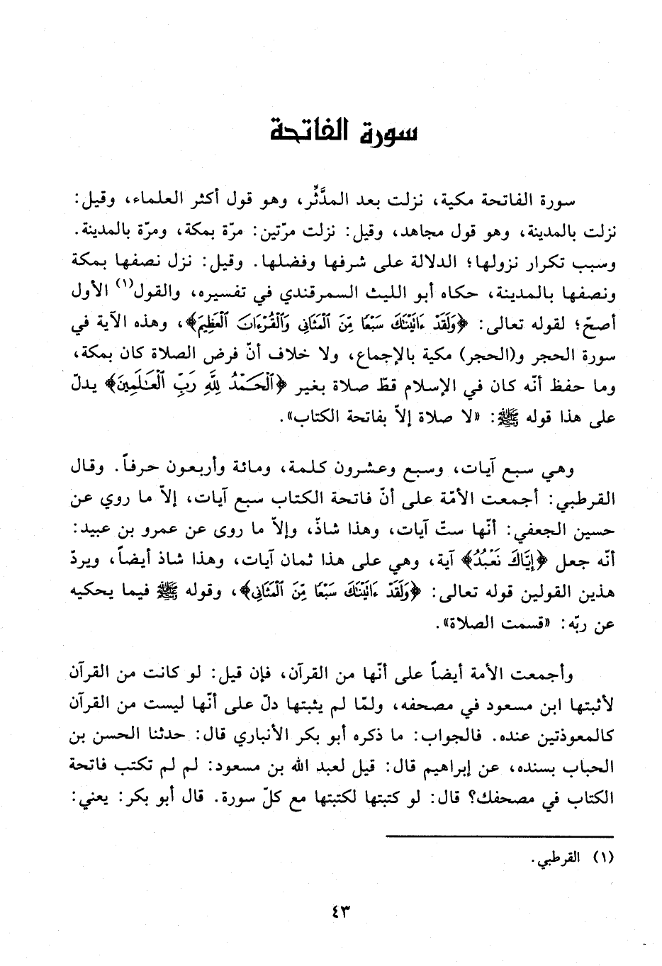 وأجمعت الأمة أيضا على أنّها من القرآن، فإن قيل: لو كانت من القرآن لأثبتها ابن مسعود في مصحفه، ولمّا لم يثبتها دلّ على أنّها ليست من القرآن كالمعوذتين عنده. فالجواب: ما ذكره أبو بكر الأنباري قال: حدثنا الحسن بن الحباب بسنده، عن إبراهيم قال: قيل لعبد الله بن مسعود: لم لم تكتب فاتحة الكتاب في مصحفك؟ قال: لو كتبتها لكتبتها مع كلّ سورة. قال أبو بكر: يعني: