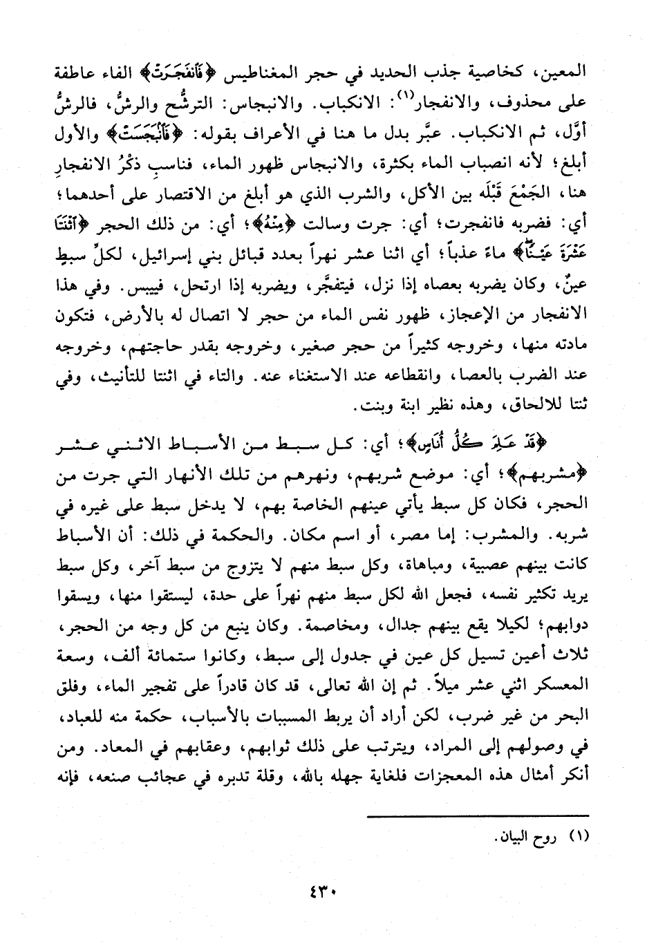 المعين، كخاصية جذب الحديد في حجر المغناطيس {فَانْفَجَرَتْ} الفاء عاطفة على محذوف، والانفجار (¬1): الانكباب. والانبجاس: الترشّح والرشّ، فالرشّ أوّل، ثم الانكباب. عبّر بدل ما هنا في الأعراف بقوله: {فَانْبَجَسَتْ} والأول أبلغ؛ لأنه انصباب الماء بكثرة، والانبجاس ظهور الماء، فناسب ذكر الانفجار هنا، الجمع قبله بين الأكل، والشرب الذي هو أبلغ من الاقتصار على أحدهما؛ أي: فضربه فانفجرت؛ أي: جرت وسالت {مِنْهُ}؛ أي: من ذلك الحجر {اثْنَتا عَشْرَةَ عَيْنًا} ماء عذبا؛ أي اثنا عشر نهرا بعدد قبائل بني إسرائيل، لكلّ سبط عين، وكان يضربه بعصاه إذا نزل، فيتفجّر، ويضربه إذا ارتحل، فييبس. وفي هذا الانفجار من الإعجاز، ظهور نفس الماء من حجر لا اتصال له بالأرض، فتكون مادته منها، وخروجه كثيرا من حجر صغير، وخروجه بقدر حاجتهم، وخروجه عند الضرب بالعصا، وانقطاعه عند الاستغناء عنه. والتاء في اثنتا للتأنيث، وفي ثنتا للالحاق، وهذه نظير ابنة وبنت.