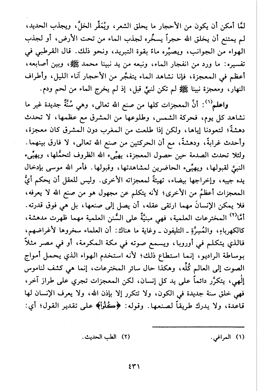 واعلم (¬1): أنّ المعجزات كلها من صنع الله تعالى، وهي سنّة جديدة غير ما نشاهد كل يوم، فحركة الشمس، وطلوعها من المشرق مع عظمها، لا تحدث دهشة؛ لتعودنا إياها، ولكن إذا طلعت من المغرب دون المشرق كان معجزة، وأحدث غرابة، ودهشة، مع أن الحركتين من صنع الله تعالى، لا فارق بينهما.