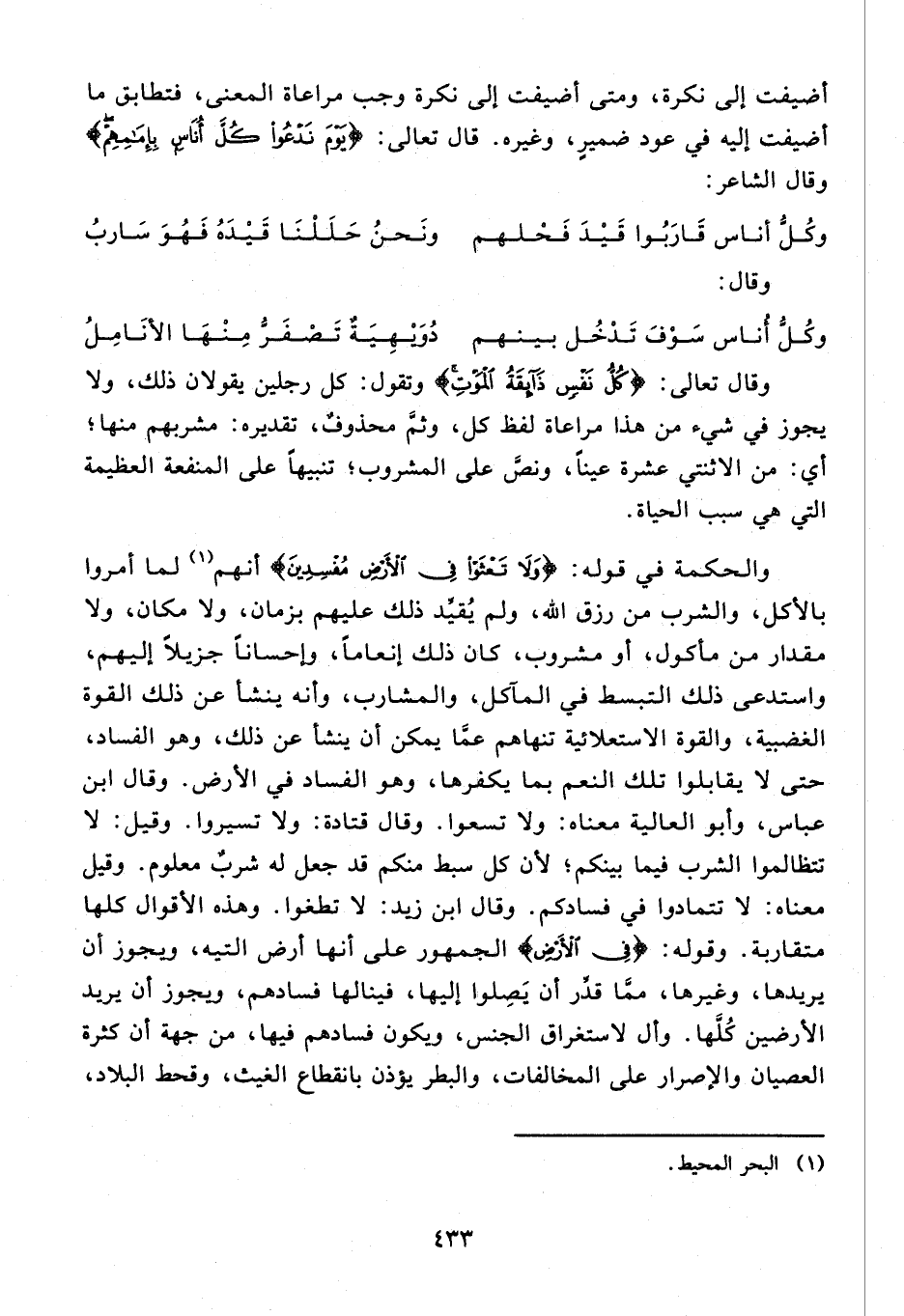 وقال تعالى: {كُلُّ نَفْسٍ ذائِقَةُ الْمَوْتِ} وتقول: كل رجلين يقولان ذلك، ولا يجوز في شيء من هذا مراعاة لفظ كل، وثمّ محذوف، تقديره: مشربهم منها؛ أي: من الاثنتي عشرة عينا، ونصّ على المشروب؛ تنبيها على المنفعة العظيمة التي هي سبب الحياة.