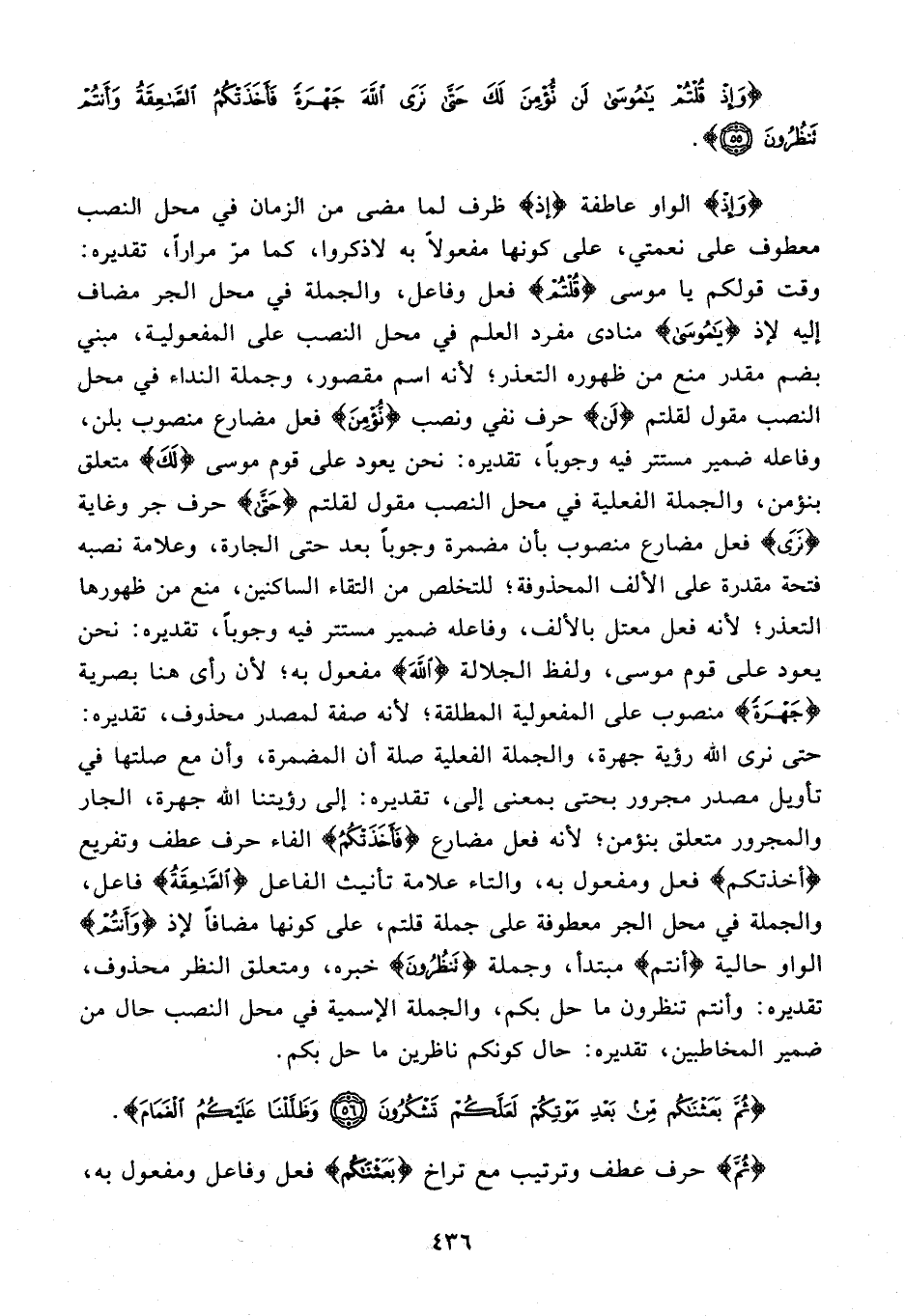 {وَإِذْ} الواو عاطفة {إِذْ} ظرف لما مضى من الزمان في محل النصب معطوف على نعمتي، على كونها مفعولا به لاذكروا، كما مرّ مرارا، تقديره: وقت قولكم يا موسى {قُلْتُمْ} فعل وفاعل، والجملة في محل الجر مضاف إليه لإذ {يا مُوسى} منادى مفرد العلم في محل النصب على المفعولية، مبني بضم مقدر منع من ظهوره التعذر؛ لأنه اسم مقصور، وجملة النداء في محل النصب مقول لقلتم {لَنْ} حرف نفي ونصب {نُؤْمِنَ} فعل مضارع منصوب بلن، وفاعله ضمير مستتر فيه وجوبا، تقديره: نحن يعود على قوم موسى {لَكَ} متعلق بنؤمن، والجملة الفعلية في محل النصب مقول لقلتم {حَتَّى} حرف جر وغاية {نَرَى} فعل مضارع منصوب بأن مضمرة وجوبا بعد حتى الجارة، وعلامة نصبه فتحة مقدرة على الألف المحذوفة؛ للتخلص من التقاء الساكنين، منع من ظهورها التعذر؛ لأنه فعل معتل بالألف، وفاعله ضمير مستتر فيه وجوبا، تقديره: نحن يعود على قوم موسى، ولفظ الجلالة {اللَّهَ} مفعول به؛ لأن رأى هنا بصرية {جَهْرَةً} منصوب على المفعولية المطلقة؛ لأنه صفة لمصدر محذوف، تقديره: حتى نرى الله رؤية جهرة، والجملة الفعلية صلة أن المضمرة، وأن مع صلتها في تأويل مصدر مجرور بحتى بمعنى إلى، تقديره: إلى رؤيتنا الله جهرة، الجار والمجرور متعلق بنؤمن؛ لأنه فعل مضارع {فَأَخَذَتْكُمُ} الفاء حرف عطف وتفريع {أخذتكم} فعل ومفعول به، والتاء علامة تأنيث الفاعل {الصَّاعِقَةُ} فاعل، والجملة في محل الجر معطوفة على جملة قلتم، على كونها مضافا لإذ {وَأَنْتُمْ} الواو حالية {أَنْتُمْ} مبتدأ، وجملة {تَنْظُرُونَ} خبره، ومتعلق النظر محذوف، تقديره: وأنتم تنظرون ما حل بكم، والجملة الإسمية في محل النصب حال من ضمير المخاطبين، تقديره: حال كونكم ناظرين ما حل بكم.