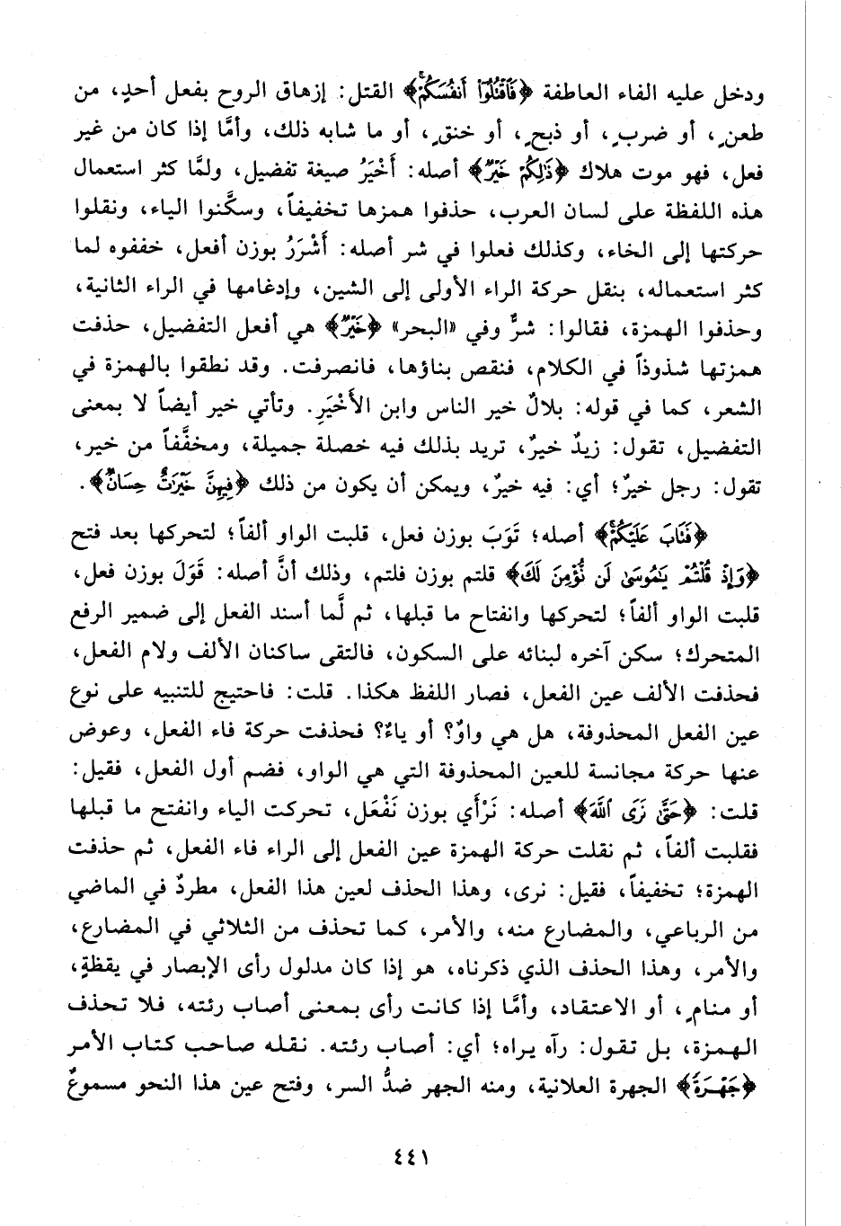{فَتابَ عَلَيْكُمْ} أصله؛ توب بوزن فعل، قلبت الواو ألفا؛ لتحركها بعد فتح {وَإِذْ قُلْتُمْ يا مُوسى لَنْ نُؤْمِنَ لَكَ} قلتم بوزن فلتم، وذلك أنّ أصله: قول بوزن فعل، قلبت الواو ألفا؛ لتحركها وانفتاح ما قبلها، ثم لمّا أسند الفعل إلى ضمير الرفع المتحرك؛ سكن آخره لبنائه على السكون، فالتقى ساكنان الألف ولام الفعل، فحذفت الألف عين الفعل، فصار اللفظ هكذا. قلت: فاحتيج للتنبيه على نوع عين الفعل المحذوفة، هل هي واو؟ أو ياء؟ فحذفت حركة فاء الفعل، وعوض عنها حركة مجانسة للعين المحذوفة التي هي الواو، فضم أول الفعل، فقيل: قلت: {حَتَّى نَرَى اللَّهَ} أصله: نرأي بوزن نفعل، تحركت الياء وانفتح ما قبلها فقلبت ألفا، ثم نقلت حركة الهمزة عين الفعل إلى الراء فاء الفعل، ثم حذفت الهمزة؛ تخفيفا، فقيل: نرى، وهذا الحذف لعين هذا الفعل، مطرد في الماضي من الرباعي، والمضارع منه، والأمر، كما تحذف من الثلاثي في المضارع، والأمر، وهذا الحذف الذي ذكرناه، هو إذا كان مدلول رأى الإبصار في يقظة، أو منام، أو الاعتقاد، وأمّا إذا كانت رأى بمعنى أصاب رئته، فلا تحذف الهمزة، بل تقول: رآه يراه؛ أي: أصاب رئته. نقله صاحب كتاب الأمر {جَهْرَةً} الجهرة العلانية، ومنه الجهر ضدّ السر، وفتح عين هذا النحو مسموع
