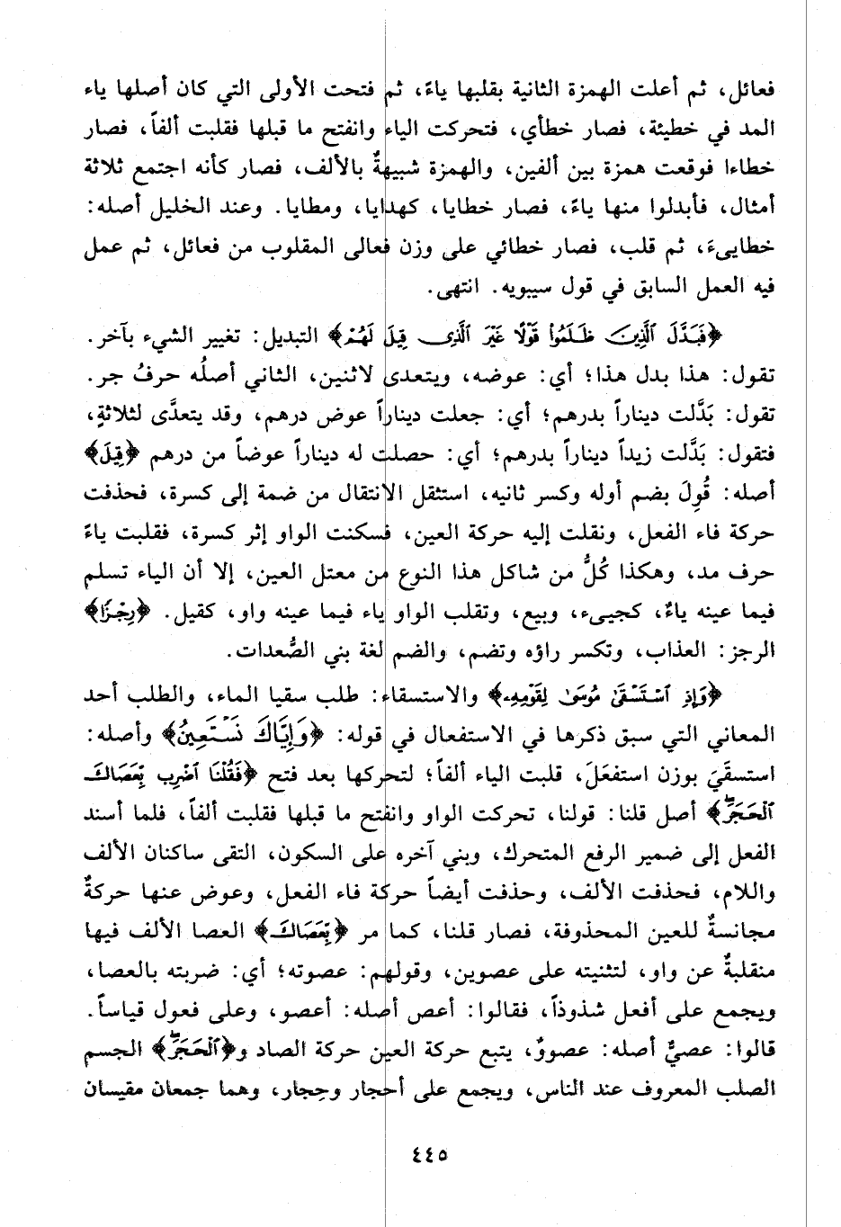 فعائل، ثم أعلت الهمزة الثانية بقلبها ياء، ثم فتحت الأولى التي كان أصلها ياء المد في خطيئة، فصار خطأي، فتحركت الياء وانفتح ما قبلها فقلبت ألفا، فصار خطاءا فوقعت همزة بين ألفين، والهمزة شبيهة بالألف، فصار كأنه اجتمع ثلاثة أمثال، فأبدلوا منها ياء، فصار خطايا، كهدايا، ومطايا. وعند الخليل أصله: خطايىء، ثم قلب، فصار خطائي على وزن فعالى المقلوب من فعائل، ثم عمل فيه العمل السابق في قول سيبويه. انتهى.