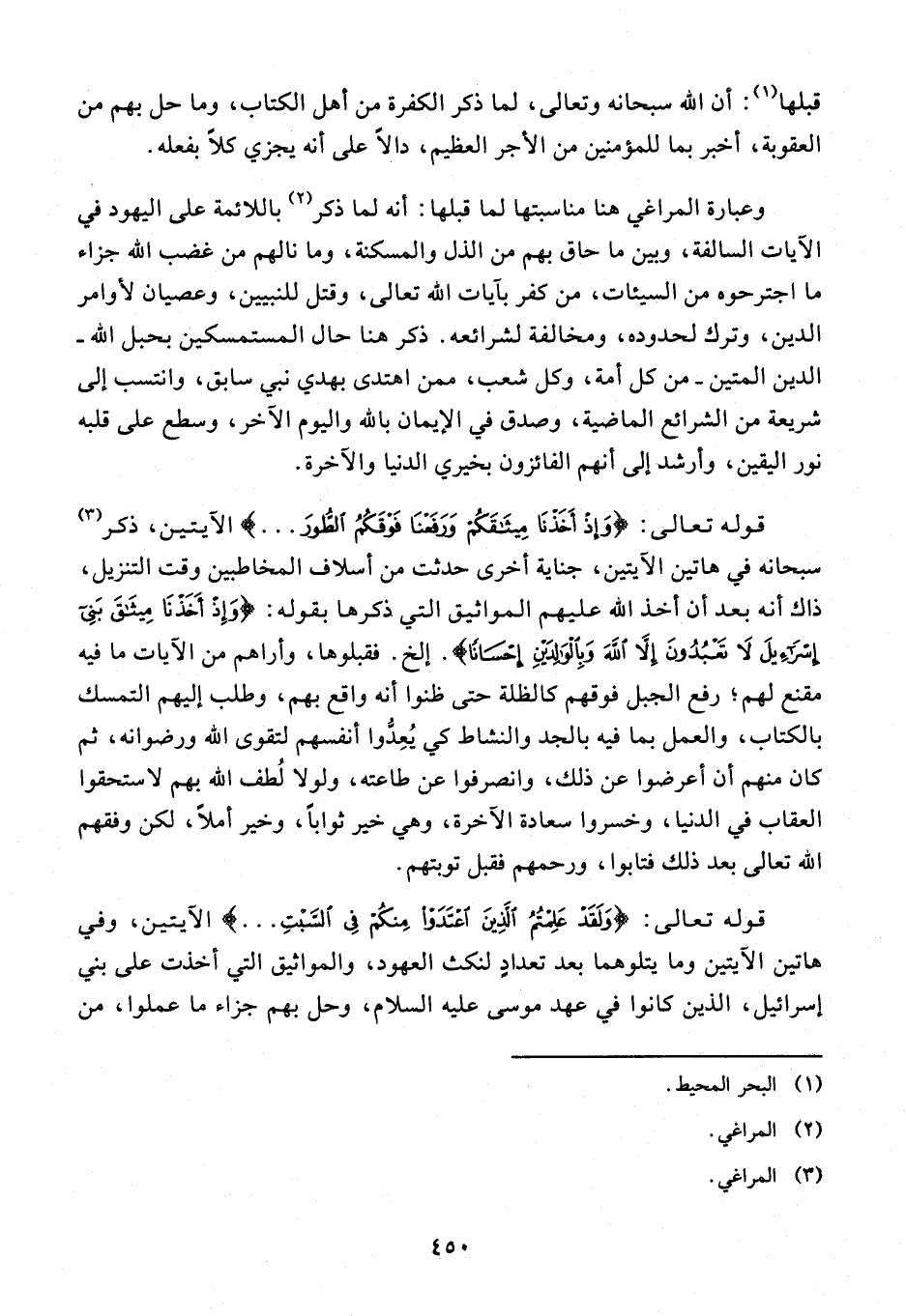 وعبارة المراغي هنا مناسبتها لما قبلها: أنه لما ذكر (¬2) باللائمة على اليهود في الآيات السالفة، وبين ما حاق بهم من الذل والمسكنة، وما نالهم من غضب الله جزاء ما اجترحوه من السيئات، من كفر بآيات الله تعالى، وقتل للنبيين، وعصيان لأوامر الدين، وترك لحدوده، ومخالفة لشرائعه. ذكر هنا حال المستمسكين بحبل الله - الدين المتين - من كل أمة، وكل شعب، ممن اهتدى بهدي نبي سابق، وانتسب إلى شريعة من الشرائع الماضية، وصدق في الإيمان بالله واليوم الآخر، وسطع على قلبه نور اليقين، وأرشد إلى أنهم الفائزون بخيري الدنيا والآخرة.