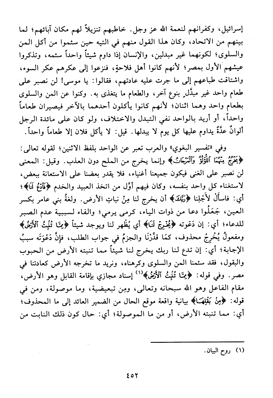 وفي «تفسير البغوي» والعرب تعبر عن الواحد بلفظ الاثنين؛ لقوله تعالى: {يَخْرُجُ مِنْهُمَا اللُّؤْلُؤُ وَالْمَرْجانُ} وإنما يخرج من الملح دون العذب. وقيل: المعنى لن نصبر على الغنى فيكون جميعنا أغنياء، فلا يقدر بعضنا على الاستعانة ببعض، لاستغناء كل واحد بنفسه، وكان فيهم أوّل من اتخذ العبيد والخدم {فَادْعُ لَنا}؛ أي: فاسأل لأجلنا {رَبَّكَ} أن يخرج لنا من نبات الأرض. ولغة بني عامر بكسر العين، جعلوا دعا من ذوات الياء، كرمى يرمي؛ والفاء لسببية عدم الصبر للدعاء؛ أي: إن دعوته {يُخْرِجْ لَنَا} أي يظهر لنا ويوجد شيئا {مِمَّا تُنْبِتُ الْأَرْضُ} ومفعول يخرج محذوف، كما قدّرنا والجزم في جواب الطلب، فإنّ دعوته سبب الإجابة؛ أي: إن تدع لنا ربك يخرج لنا شيئا مما تنبته الأرض من الحبوب والبقول، فقد سئمنا المن والسلوى وكرهناه، ونريد ما تخرجه الأرض كعادتنا في مصر. وفي قوله: {مِمَّا تُنْبِتُ الْأَرْضُ} (¬1) إسناد مجازي بإقامة القابل وهو الأرض، مقام الفاعل وهو الله سبحانه وتعالى، ومن تبعيضية، وما موصولة، ومن في قوله: {مِنْ بَقْلِها} بيانية واقعة موقع الحال من الضمير العائد إلى ما المحذوف؛ أي: مما تنبته الأرض، أو من ما الموصولة؛ أي: حال كون ذلك النابت من