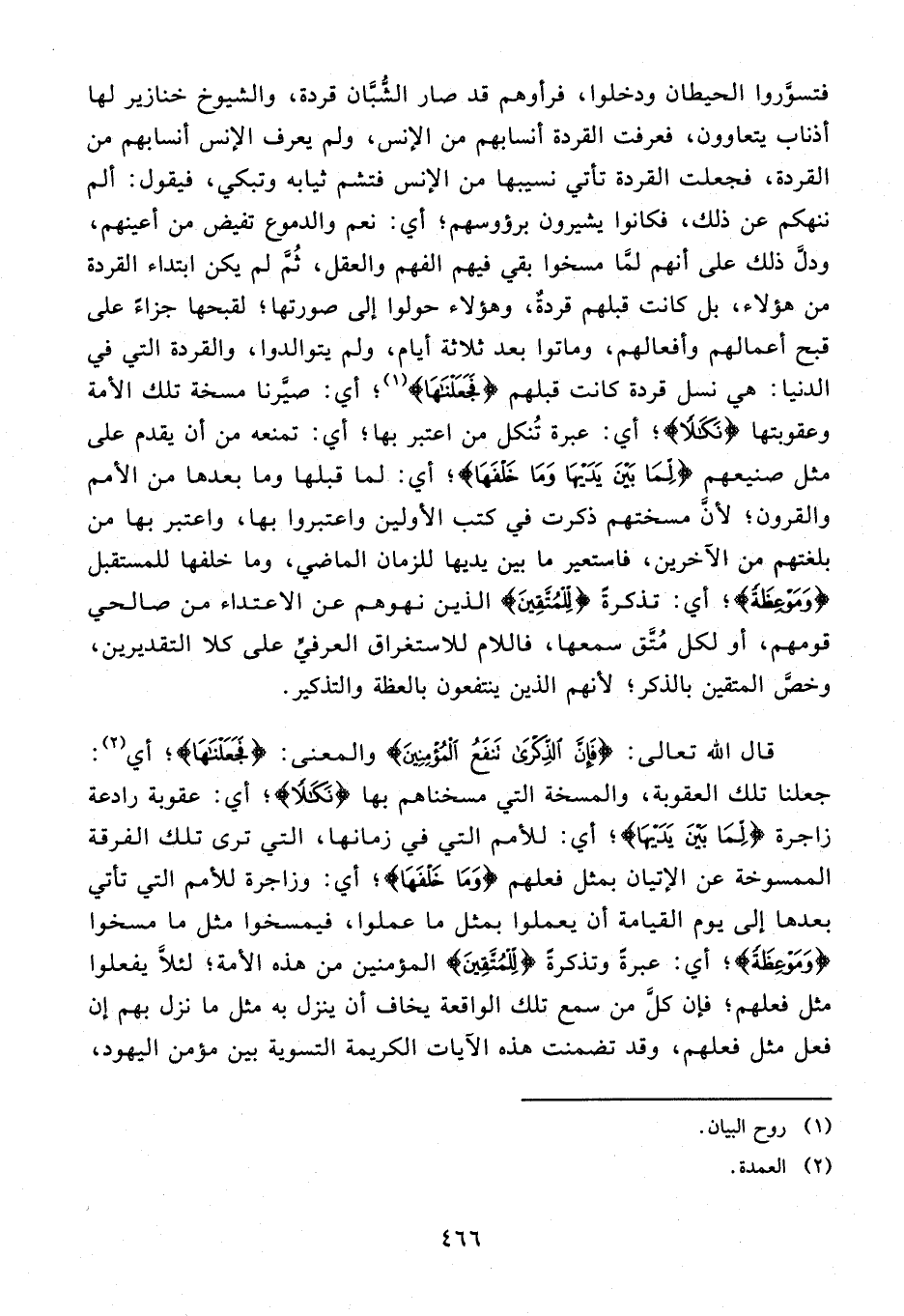 66 - {فَجَعَلْناها} (¬1)؛ أي: صيّرنا مسخة تلك الأمة وعقوبتها {نَكالًا}؛ أي: عبرة تنكل من اعتبر بها؛ أي: تمنعه من أن يقدم على مثل صنيعهم {لِما بَيْنَ يَدَيْها وَما خَلْفَها}؛ أي: لما قبلها وما بعدها من الأمم والقرون؛ لأنّ مسختهم ذكرت في كتب الأولين واعتبروا بها، واعتبر بها من بلغتهم من الآخرين، فاستعير ما بين يديها للزمان الماضي، وما خلفها للمستقبل {وَمَوْعِظَةً}؛ أي: تذكرة {لِلْمُتَّقِينَ} الذين نهوهم عن الاعتداء من صالحي قومهم، أو لكل متّق سمعها، فاللام للاستغراق العرفيّ على كلا التقديرين، وخصّ المتقين بالذكر؛ لأنهم الذين ينتفعون بالعظة والتذكير.