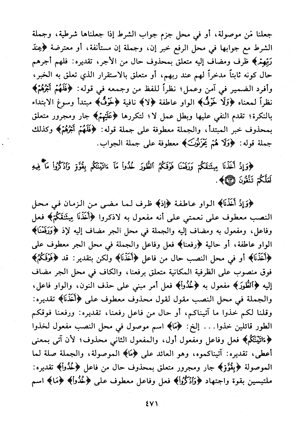 {وَإِذْ أَخَذْنا} الواو عاطفة {إِذْ} ظرف لما مضى من الزمان في محل النصب معطوف على نعمتي على أنه مفعول به لاذكروا {أَخَذْنا مِيثاقَكُمْ} فعل وفاعل، ومفعول به ومضاف إليه والجملة في محل الجر مضاف إليه لإذ {وَرَفَعْنا} الواو عاطفة، أو حالية {رَفَعْنا} فعل وفاعل والجملة في محل الجر معطوف على {أَخَذْنا} أو في محل النصب حال من فاعل {أَخَذْنا} ولكن بتقدير: قد {فَوْقَكُمُ} فوق منصوب على الظرفية المكانية متعلق برفعنا، والكاف في محل الجر مضاف إليه {الطُّورَ} مفعول به {خُذُوا} فعل أمر مبني على حذف النون، والواو فاعل، والجملة في محل النصب مقول لقول محذوف معطوف على {أَخَذْنا} تقديره: وقلنا لكم خذوا ما آتيناكم، أو حال من فاعل رفعنا، تقديره: ورفعنا فوقكم الطور قائلين خذوا ... إلخ: {ما} اسم موصول في محل النصب مفعول لخذوا {آتَيْناكُمْ} فعل وفاعل ومفعول أول، والمفعول الثاني محذوف؛ لأن آتى بمعنى أعطى، تقديره: آتيناكموه، وهو العائد على {ما} الموصولة، والجملة صلة لما الموصولة {بِقُوَّةٍ} جار ومجرور متعلق بمحذوف حال من فاعل {خُذُوا} تقديره: ملتبسين بقوة واجتهاد {وَاذْكُرُوا} فعل وفاعل معطوف على {خُذُوا} {ما} اسم