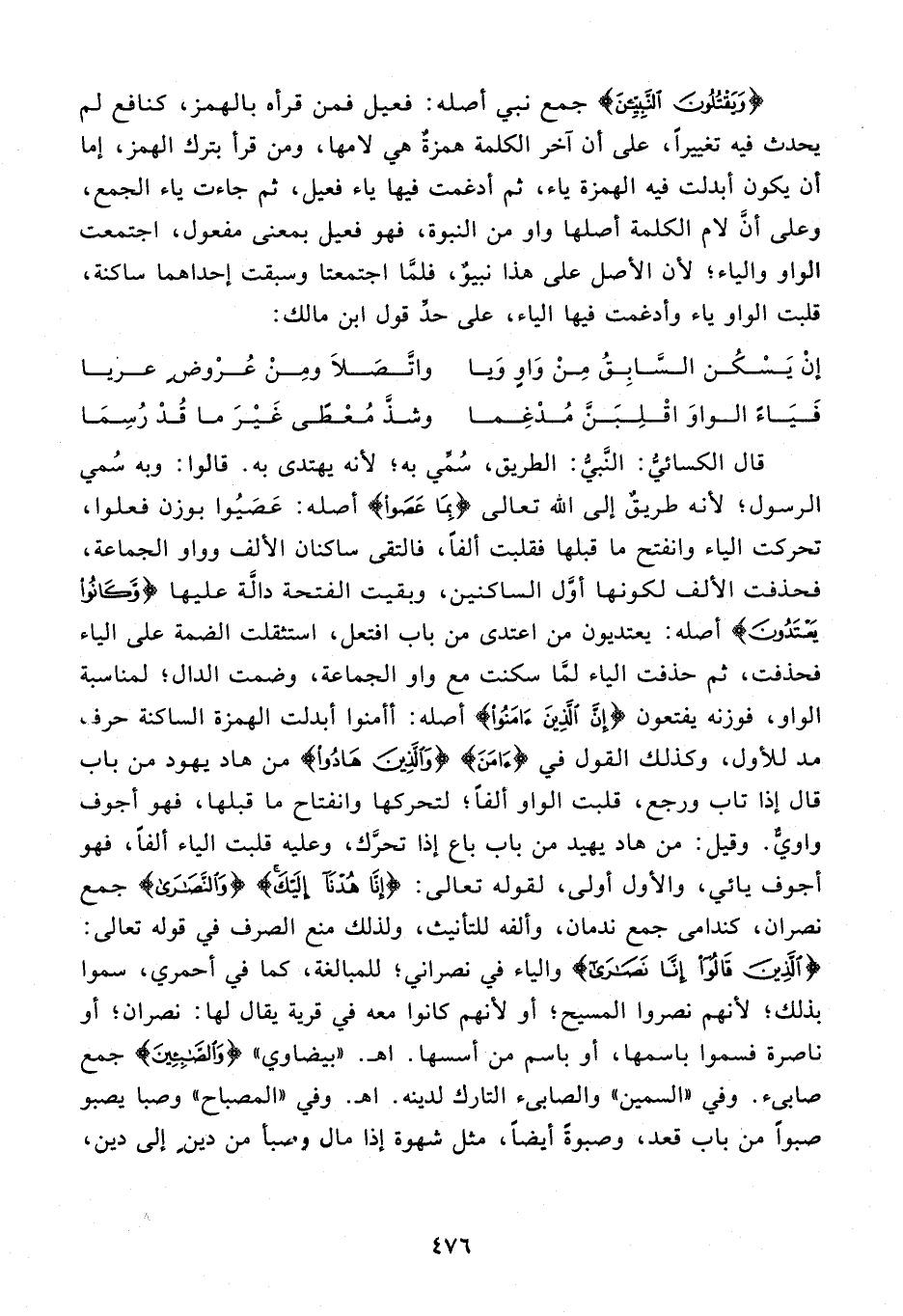 قال الكسائيّ: النّبيّ: الطريق، سمّي به؛ لأنه يهتدى به. قالوا: وبه سمي الرسول؛ لأنه طريق إلى الله تعالى {بِما عَصَوْا} أصله: عصيوا بوزن فعلوا، تحركت الياء وانفتح ما قبلها فقلبت ألفا، فالتقى ساكنان الألف وواو الجماعة، فحذفت الألف لكونها أوّل الساكنين، وبقيت الفتحة دالّة عليها {وَكانُوا يَعْتَدُونَ} أصله: يعتديون من اعتدى من باب افتعل، استثقلت الضمة على الياء فحذفت، ثم حذفت الياء لمّا سكنت مع واو الجماعة، وضمت الدال؛ لمناسبة الواو، فوزنه يفتعون {إِنَّ الَّذِينَ آمَنُوا} أصله: أأمنوا أبدلت الهمزة الساكنة حرف مد للأول، وكذلك القول في {آمن} {وَالَّذِينَ هادُوا} من هاد يهود من باب قال إذا تاب ورجع، قلبت الواو ألفا؛ لتحركها وانفتاح ما قبلها، فهو أجوف واويّ. وقيل: من هاد يهيد من باب باع إذا تحرّك، وعليه قلبت الياء ألفا، فهو أجوف يائي، والأول أولى، لقوله تعالى: {إِنَّا هُدْنا إِلَيْكَ} {وَالنَّصارى} جمع نصران، كندامى جمع ندمان، وألفه للتأنيث، ولذلك منع الصرف في قوله تعالى: {الَّذِينَ قالُوا إِنَّا نَصارى} والياء في نصراني؛ للمبالغة، كما في أحمري، سموا بذلك؛ لأنهم نصروا المسيح؛ أو لأنهم كانوا معه في قرية يقال لها: نصران؛ أو ناصرة فسموا باسمها، أو باسم من أسسها. اه. «بيضاوي» {وَالصَّابِئِينَ} جمع صابىء. وفي «السمين» والصابىء التارك لدينه. اه. وفي «المصباح» وصبا يصبو صبوا من باب قعد، وصبوة أيضا، مثل شهوة إذا مال وصبأ من دين إلى دين،