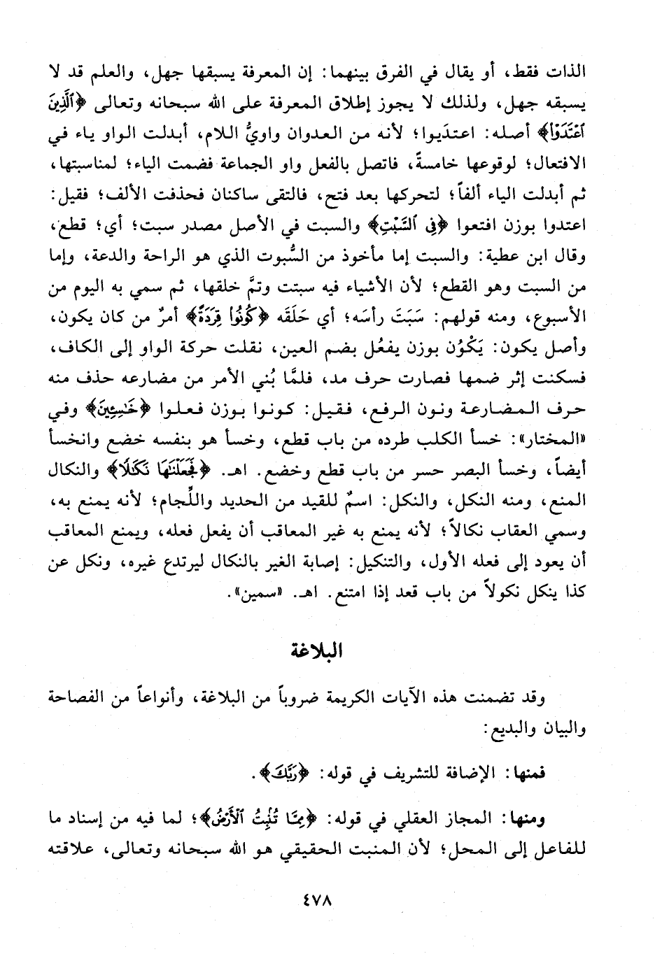 الذات فقط، أو يقال في الفرق بينهما: إن المعرفة يسبقها جهل، والعلم قد لا يسبقه جهل، ولذلك لا يجوز إطلاق المعرفة على الله سبحانه وتعالى {الَّذِينَ اعْتَدَوْا} أصله: اعتديوا؛ لأنه من العدوان واويّ اللام، أبدلت الواو ياء في الافتعال؛ لوقوعها خامسة، فاتصل بالفعل واو الجماعة فضمت الياء؛ لمناسبتها، ثم أبدلت الياء ألفا؛ لتحركها بعد فتح، فالتقى ساكنان فحذفت الألف؛ فقيل: اعتدوا بوزن افتعوا {فِي السَّبْتِ} والسبت في الأصل مصدر سبت؛ أي؛ قطع، وقال ابن عطية: والسبت إما مأخوذ من السّبوت الذي هو الراحة والدعة، وإما من السبت وهو القطع؛ لأن الأشياء فيه سبتت وتمّ خلقها، ثم سمي به اليوم من الأسبوع، ومنه قولهم: سبت رأسه؛ أي حلقه {كُونُوا قِرَدَةً} أمر من كان يكون، وأصل يكون: يكون بوزن يفعل بضم العين، نقلت حركة الواو إلى الكاف، فسكنت إثر ضمها فصارت حرف مد، فلمّا بني الأمر من مضارعه حذف منه حرف المضارعة ونون الرفع، فقيل: كونوا بوزن فعلوا {خاسِئِينَ} وفي «المختار»: خسأ الكلب طرده من باب قطع، وخسأ هو بنفسه خضع وانخسأ أيضا، وخسأ البصر حسر من باب قطع وخضع. اه. {فَجَعَلْناها نَكالًا} والنكال المنع، ومنه النكل، والنكل: اسم للقيد من الحديد واللّجام؛ لأنه يمنع به، وسمي العقاب نكالا؛ لأنه يمنع به غير المعاقب أن يفعل فعله، ويمنع المعاقب أن يعود إلى فعله الأول، والتنكيل: إصابة الغير بالنكال ليرتدع غيره، ونكل عن كذا ينكل نكولا من باب قعد إذا امتنع. اه. «سمين».