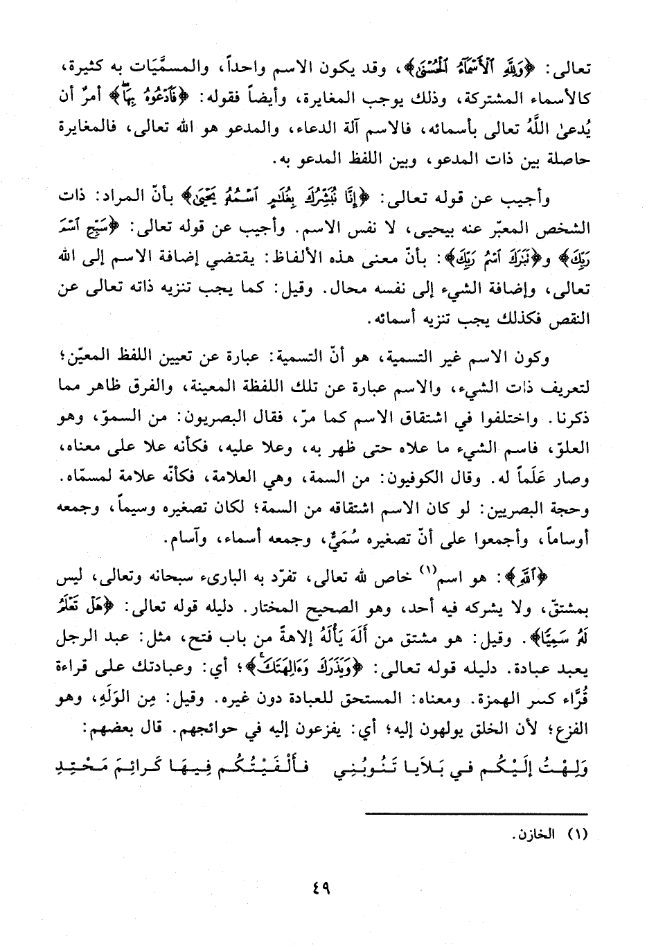 وأجيب عن قوله تعالى: {إِنَّا نُبَشِّرُكَ بِغُلامٍ اسْمُهُ يَحْيى} بأنّ المراد: ذات الشخص المعبّر عنه بيحيى، لا نفس الاسم. وأجيب عن قوله تعالى: {سَبِّحِ اسْمَ رَبِّكَ} و {تَبارَكَ اسْمُ رَبِّكَ}: بأنّ معنى هذه الألفاظ: يقتضي إضافة الاسم إلى الله تعالى، وإضافة الشيء إلى نفسه محال. وقيل: كما يجب تنزيه ذاته تعالى عن النقص فكذلك يجب تنزيه أسمائه.
