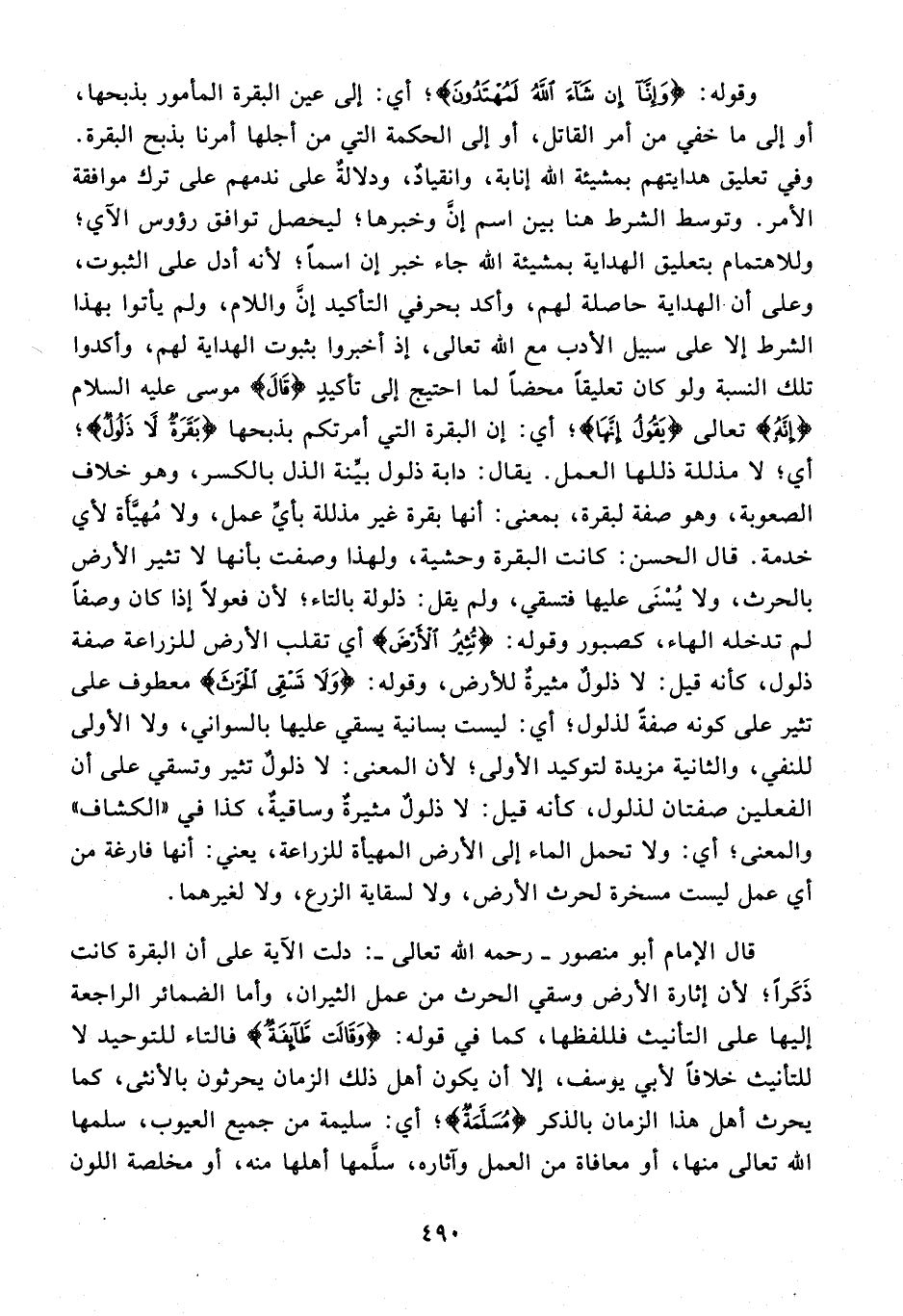 قال الإمام أبو منصور - رحمه الله تعالى -: دلت الآية على أن البقرة كانت ذكرا؛ لأن إثارة الأرض وسقي الحرث من عمل الثيران، وأما الضمائر الراجعة إليها على التأنيث فللفظها، كما في قوله: {وَقالَتْ طائِفَةٌ} فالتاء للتوحيد لا للتأنيث خلافا لأبي يوسف، إلا أن يكون أهل ذلك الزمان يحرثون بالأنثى، كما يحرث أهل هذا الزمان بالذكر {مُسَلَّمَةٌ}؛ أي: سليمة من جميع العيوب، سلمها الله تعالى منها، أو معافاة من العمل وآثاره، سلّمها أهلها منه، أو مخلصة اللون
