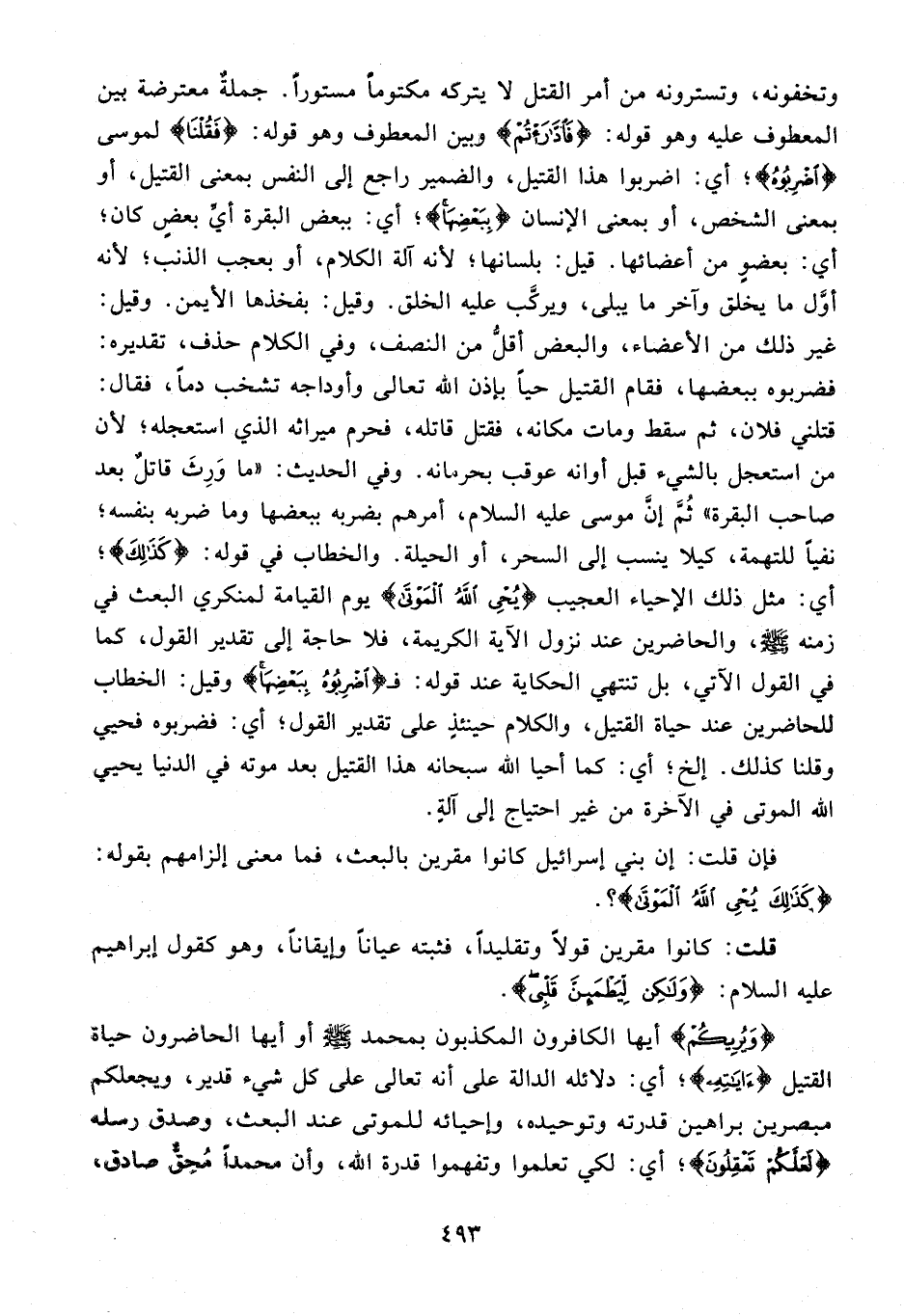 73 - {فَقُلْنا} لموسى {اضْرِبُوهُ}؛ أي: اضربوا هذا القتيل، والضمير راجع إلى النفس بمعنى القتيل، أو بمعنى الشخص، أو بمعنى الإنسان {بِبَعْضِها}؛ أي: ببعض البقرة أيّ بعض كان؛ أي: بعضو من أعضائها. قيل: بلسانها؛ لأنه آلة الكلام، أو بعجب الذنب؛ لأنه أوّل ما يخلق وآخر ما يبلى، ويركّب عليه الخلق. وقيل: بفخذها الأيمن. وقيل: غير ذلك من الأعضاء، والبعض أقلّ من النصف، وفي الكلام حذف، تقديره: فضربوه ببعضها، فقام القتيل حيا بإذن الله تعالى وأوداجه تشخب دما، فقال: قتلني فلان، ثم سقط ومات مكانه، فقتل قاتله، فحرم ميراثه الذي استعجله؛ لأن من استعجل بالشيء قبل أوانه عوقب بحرمانه. وفي الحديث: «ما ورث قاتل بعد صاحب البقرة» ثمّ إنّ موسى عليه السلام، أمرهم بضربه ببعضها وما ضربه بنفسه؛ نفيا للتهمة، كيلا ينسب إلى السحر، أو الحيلة. والخطاب في قوله: {كَذلِكَ}؛ أي: مثل ذلك الإحياء العجيب {يُحْيِ اللَّهُ الْمَوْتى} يوم القيامة لمنكري البعث في زمنه صلّى الله عليه وسلّم، والحاضرين عند نزول الآية الكريمة، فلا حاجة إلى تقدير القول، كما في القول الآتي، بل تنتهي الحكاية عند قوله: فـ {اضْرِبُوهُ بِبَعْضِها} وقيل: الخطاب للحاضرين عند حياة القتيل، والكلام حينئذ على تقدير القول؛ أي: فضربوه فحيي وقلنا كذلك. إلخ؛ أي: كما أحيا الله سبحانه هذا القتيل بعد موته في الدنيا يحيي الله الموتى في الآخرة من غير احتياج إلى آلة.