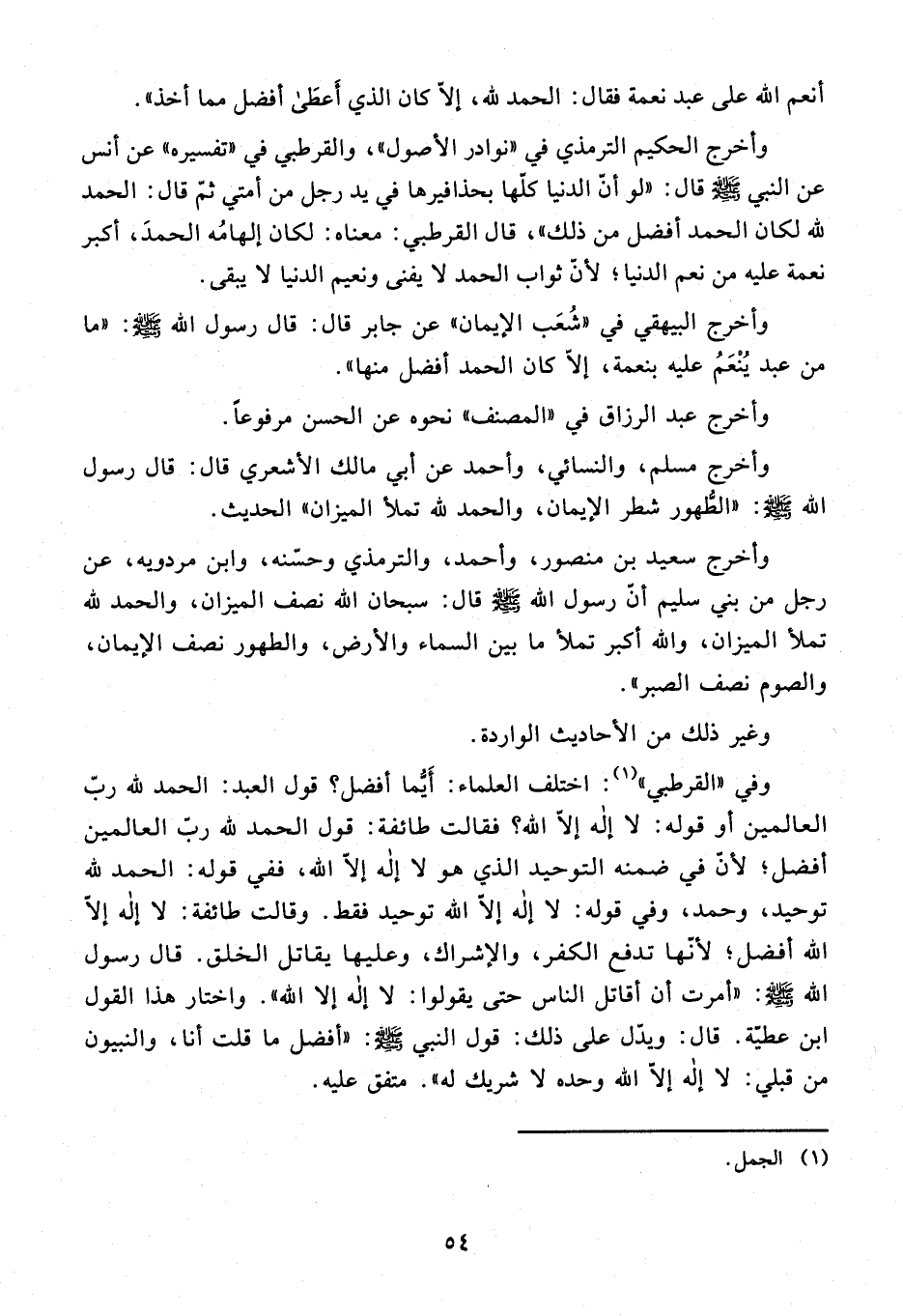 وأخرج البيهقي في «شعب الإيمان» عن جابر قال: قال رسول الله صلّى الله عليه وسلّم: «ما من عبد ينعم عليه بنعمة، إلّا كان الحمد أفضل منها».