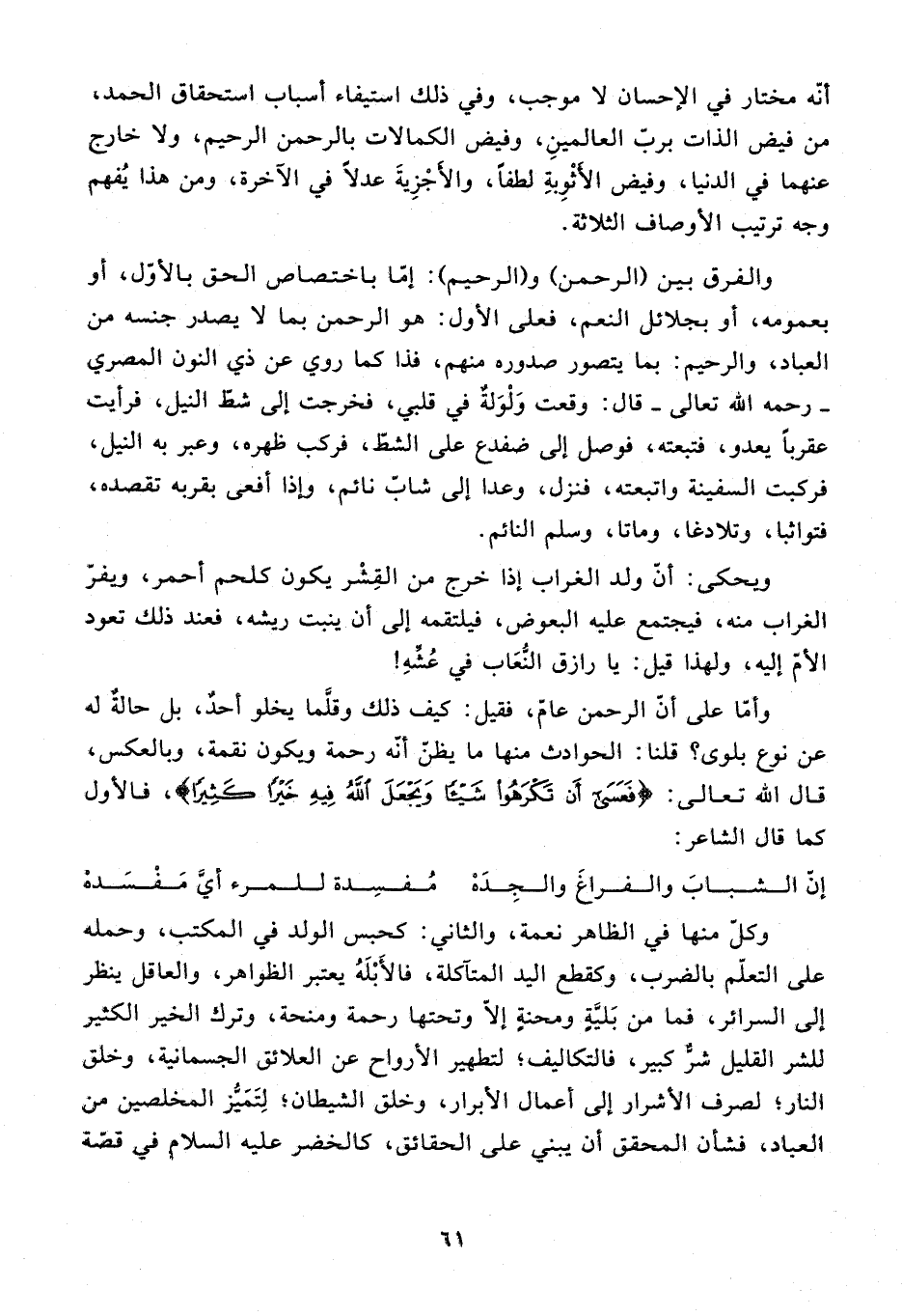 وكلّ منها في الظاهر نعمة، والثاني: كحبس الولد في المكتب، وحمله على التعلّم بالضرب، وكقطع اليد المتآكلة، فالأبله يعتبر الظواهر، والعاقل ينظر إلى السرائر، فما من بليّة ومحنة إلّا وتحتها رحمة ومنحة، وترك الخير الكثير للشر القليل شرّ كبير، فالتكاليف؛ لتطهير الأرواح عن العلائق الجسمانية، وخلق النار؛ لصرف الأشرار إلى أعمال الأبرار، وخلق الشيطان؛ لتميّز المخلصين من العباد، فشأن المحقق أن يبني على الحقائق، كالخضر عليه السلام في قصّة