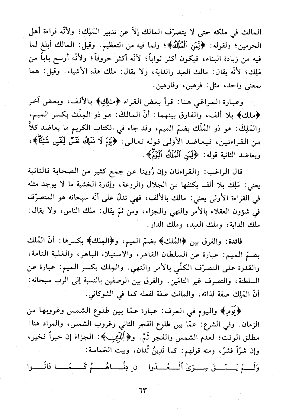 وعبارة المراغي هنا: قرأ بعض القراء {مالك} بالألف، وبعض آخر {ملك} بلا ألف، والفارق بينهما: أنّ المالك: هو ذو الملك بكسر الميم، والملك: هو ذو الملك بضمّ الميم، وقد جاء في الكتاب الكريم ما يعاضد كلّا من القراءتين، فيعاضد الأولى قوله تعالى: {يَوْمَ لا تَمْلِكُ نَفْسٌ لِنَفْسٍ شَيْئًا}، ويعاضد الثانية قوله: {لِمَنِ الْمُلْكُ الْيَوْمَ}.