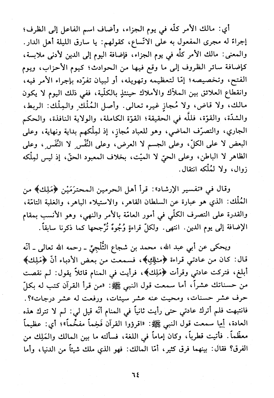 فانتبهت فلم أترك عادتي حتى رأيت ثانيا في المنام أنّه قيل لي: لم لا تترك هذه العادة، أما سمعت قول النبي صلّى الله عليه وسلّم: «اقرؤوا القرآن فخما مفخّما»؛ أي: عظيما معظّما. فأتيت قطربا، وكان إماما في اللغة، فسألته ما بين المالك والملك من الفرق؟ فقال: بينهما فرق كثير، أمّا المالك: فهو الذي ملك شيئا من الدنيا، وأما