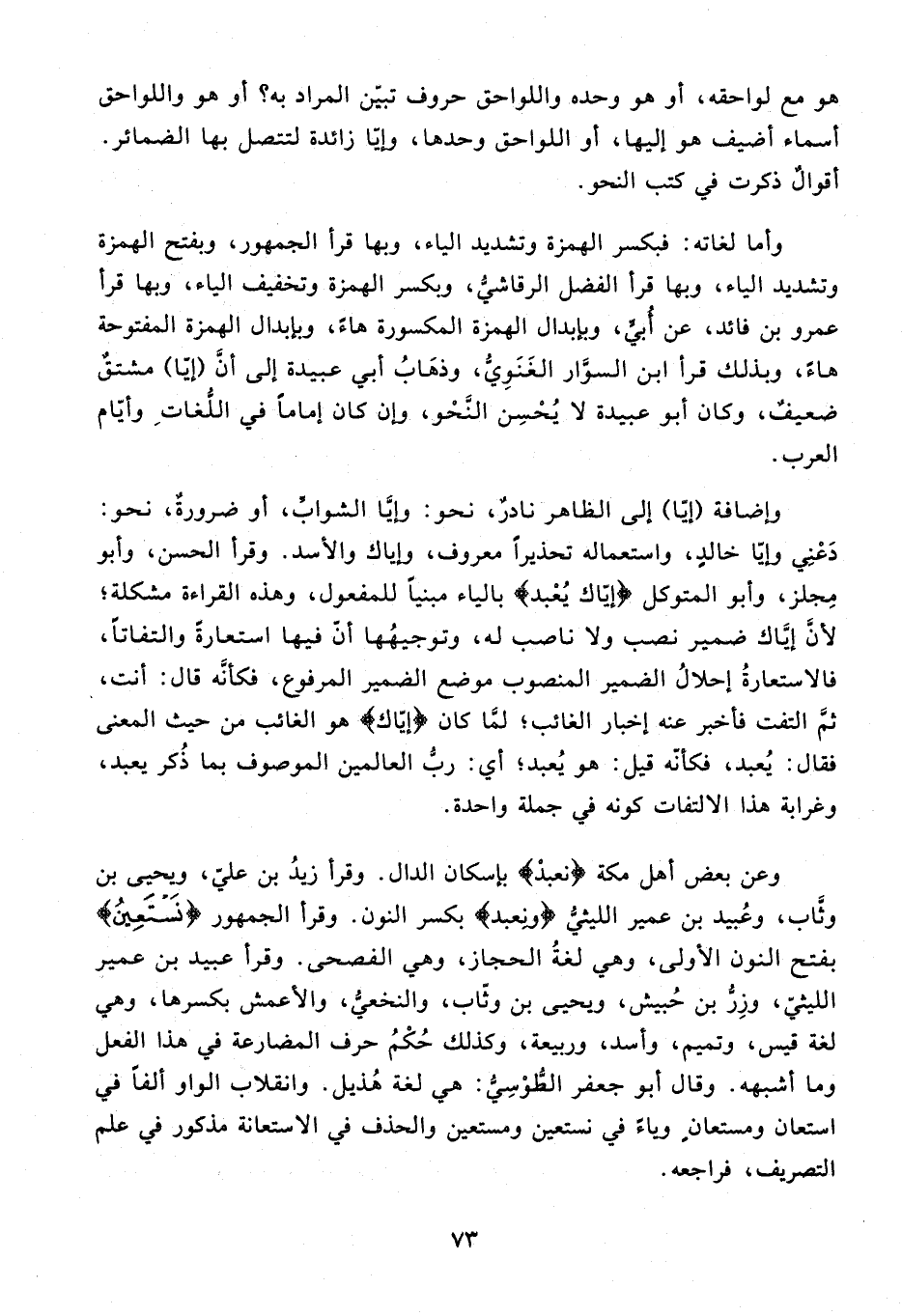 وإضافة (إيّا) إلى الظاهر نادر، نحو: وإيّا الشوابّ، أو ضرورة، نحو: دعني وإيّا خالد، واستعماله تحذيرا معروف، وإياك والأسد. وقرأ الحسن، وأبو مجلز، وأبو المتوكل {إيّاك يعبد} بالياء مبنيا للمفعول، وهذه القراءة مشكلة؛ لأنّ إيّاك ضمير نصب ولا ناصب له، وتوجيهها أنّ فيها استعارة والتفاتا، فالاستعارة إحلال الضمير المنصوب موضع الضمير المرفوع، فكأنّه قال: أنت، ثمّ التفت فأخبر عنه إخبار الغائب؛ لمّا كان {إِيَّاكَ} هو الغائب من حيث المعنى فقال: يعبد، فكأنّه قيل: هو يعبد؛ أي: ربّ العالمين الموصوف بما ذكر يعبد، وغرابة هذا الالتفات كونه في جملة واحدة.