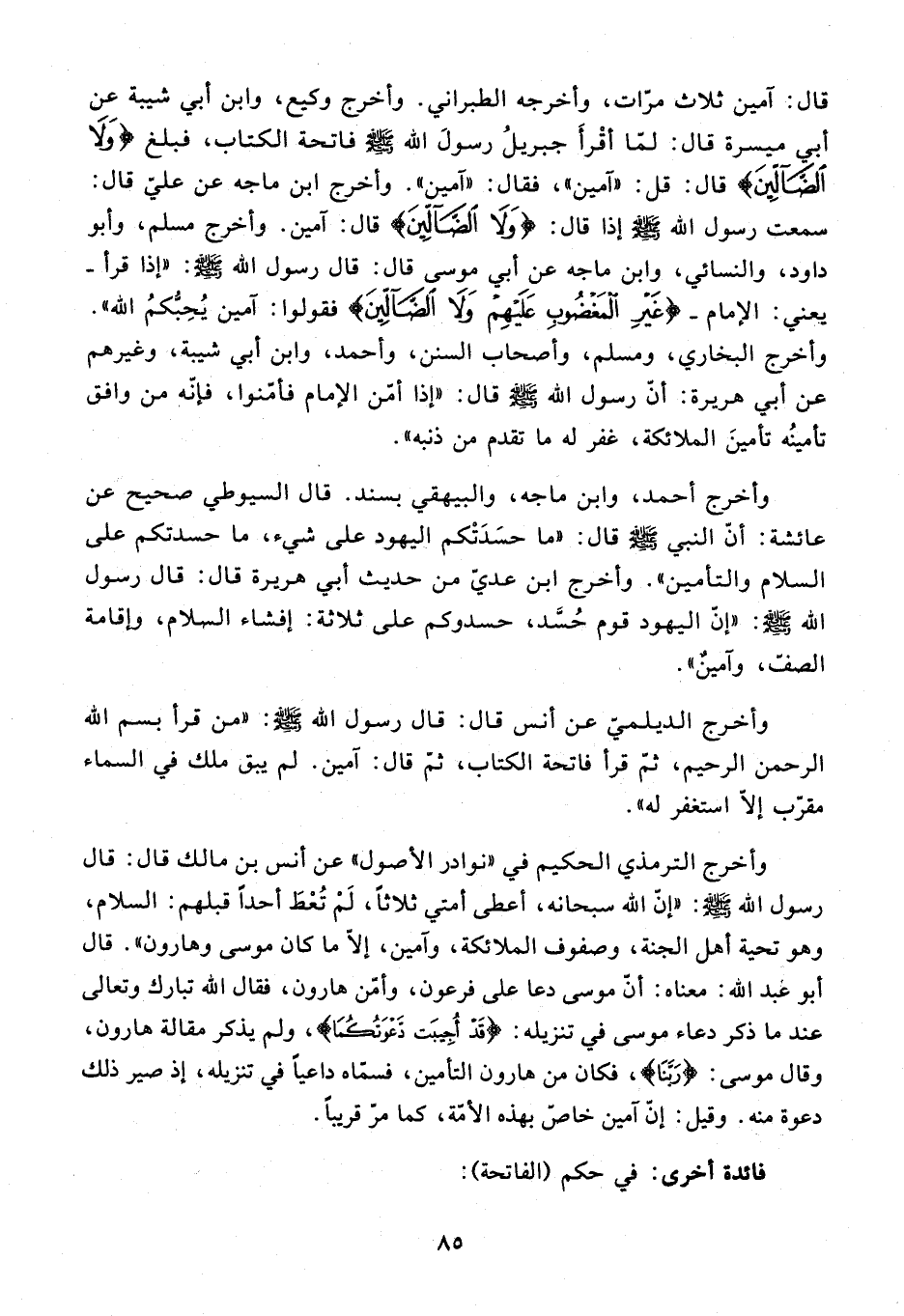 وأخرج أحمد، وابن ماجه، والبيهقي بسند. قال السيوطي صحيح عن عائشة: أنّ النبي صلّى الله عليه وسلّم قال: «ما حسدتكم اليهود على شيء، ما حسدتكم على السلام والتأمين». وأخرج ابن عديّ من حديث أبي هريرة قال: قال رسول الله صلّى الله عليه وسلّم: «إنّ اليهود قوم حسّد، حسدوكم على ثلاثة: إفشاء السلام، وإقامة الصفّ، وآمين».