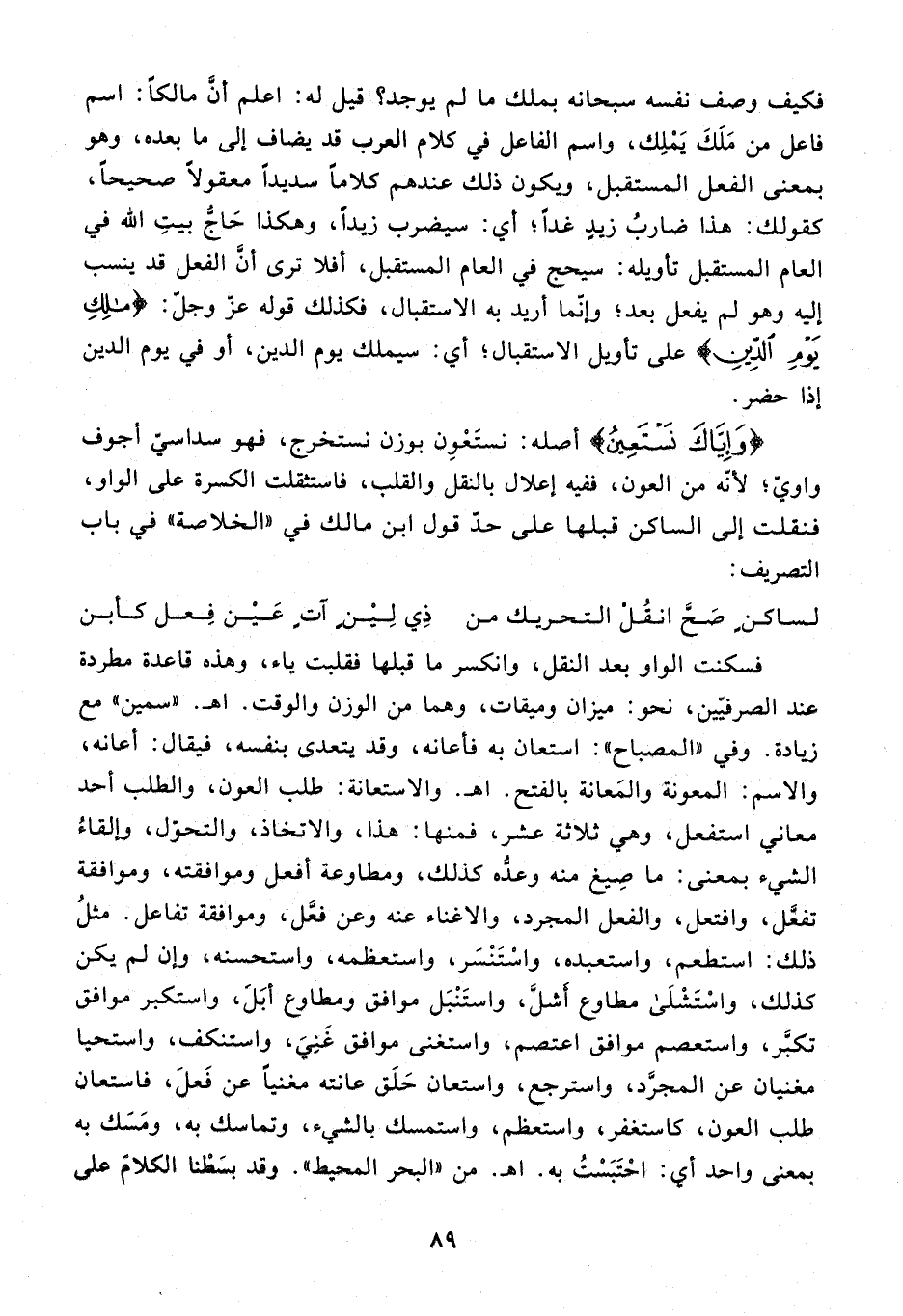 {وَإِيَّاكَ نَسْتَعِينُ} أصله: نستعون بوزن نستخرج، فهو سداسيّ أجوف واويّ؛ لأنّه من العون، ففيه إعلال بالنقل والقلب، فاستثقلت الكسرة على الواو، فنقلت إلى الساكن قبلها على حدّ قول ابن مالك في «الخلاصة» في باب التصريف:
