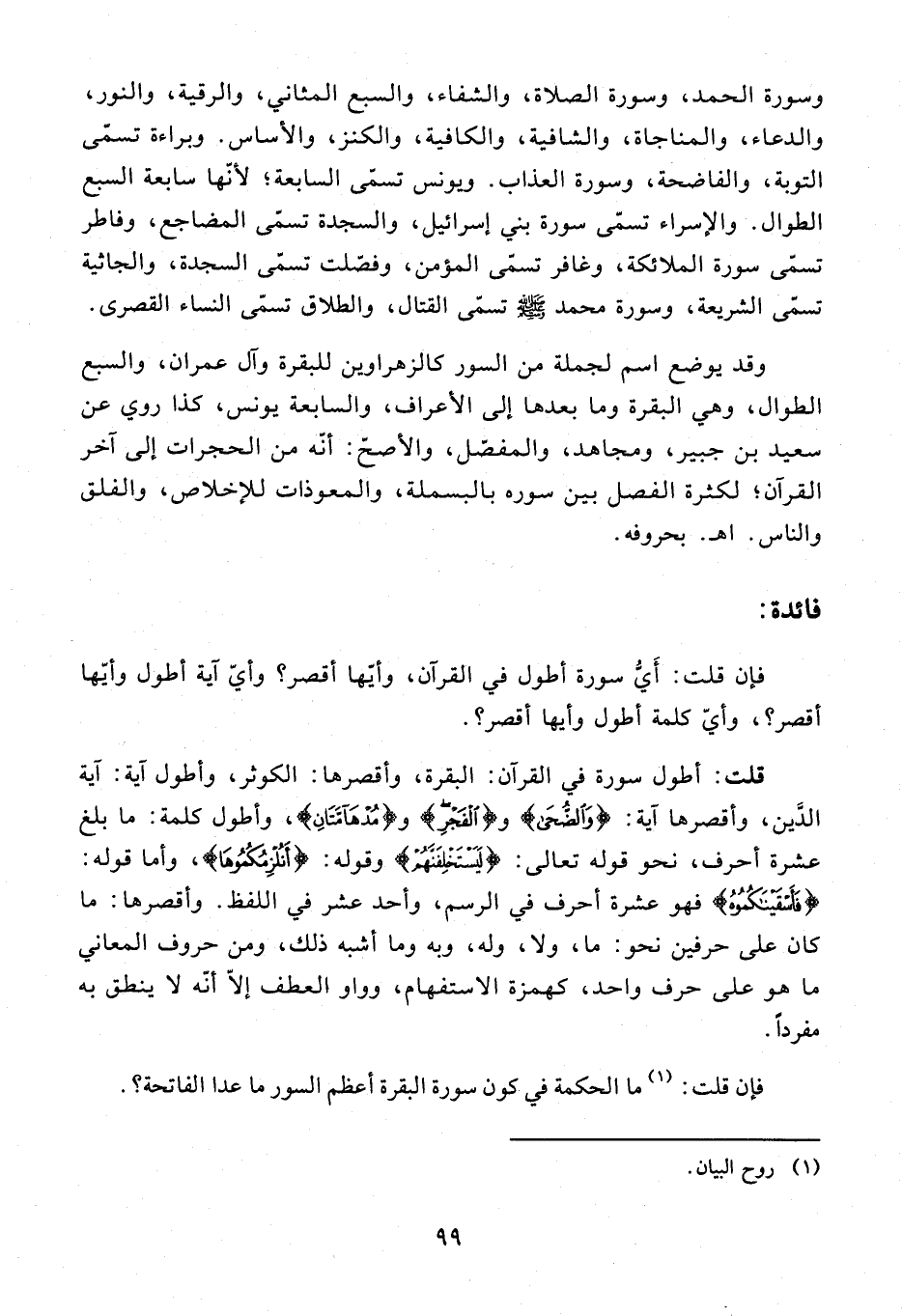 فإن قلت: أيّ سورة أطول في القرآن، وأيّها أقصر؟ وأيّ آية أطول وأيّها أقصر؟، وأيّ كلمة أطول وأيها أقصر؟.