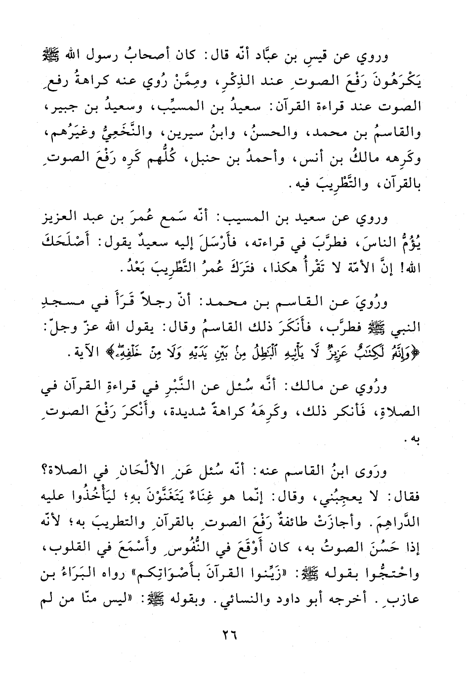وروي عن قيس بن عبّاد أنّه قال: كان أصحاب رسول الله صلّى الله عليه وسلم يكرهون رفع الصوت عند الذكر، وممّن روي عنه كراهة رفع الصوت عند قراءة القرآن: سعيد بن المسيّب، وسعيد بن جبير، والقاسم بن محمد، والحسن، وابن سيرين، والنّخعيّ وغيرهم، وكرهه مالك بن أنس، وأحمد بن حنبل، كلّهم كره رفع الصوت بالقرآن، والتّطريب فيه.