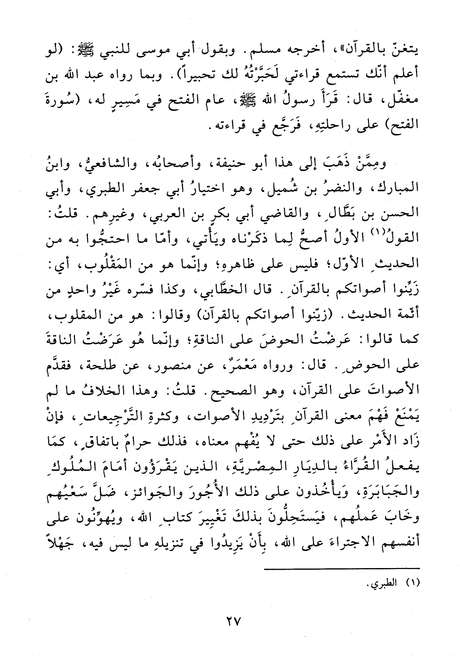 يتغنّ بالقرآن»، أخرجه مسلم. وبقول أبي موسى للنبي صلّى الله عليه وسلم: (لو أعلم أنّك تستمع قراءتي لحبّرته لك تحبيرا). وبما رواه عبد الله بن مغفّل، قال: قرأ رسول الله صلّى الله عليه وسلم، عام الفتح في مسير له، (سورة الفتح) على راحلته، فرجّع في قراءته.