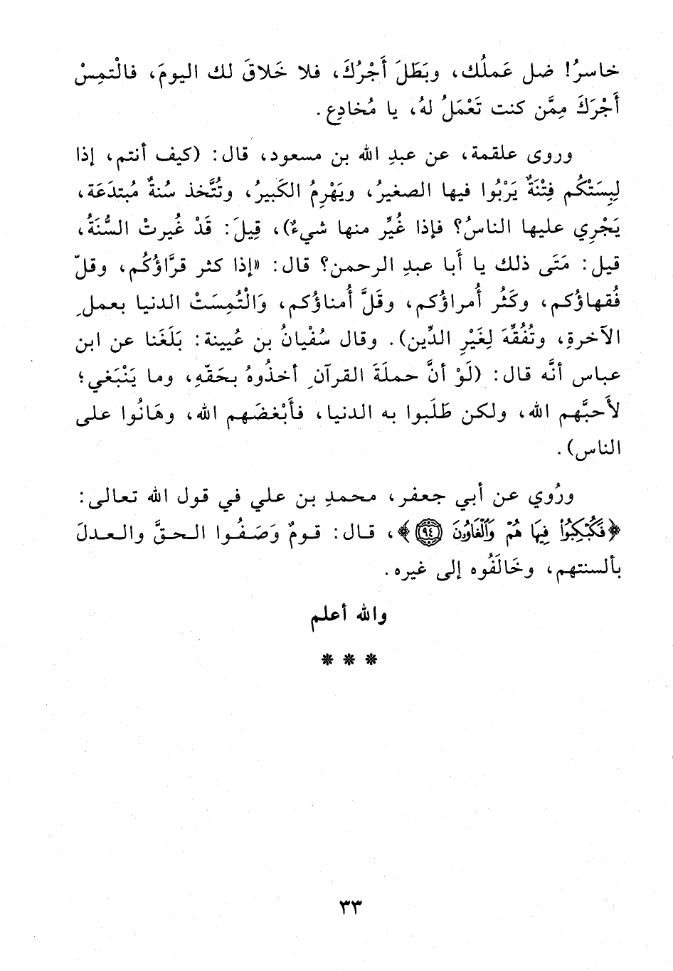 وروى علقمة، عن عبد الله بن مسعود، قال: (كيف أنتم، إذا لبستكم فتنة يربوا فيها الصغير، ويهرم الكبير، وتتّخذ سنة مبتدعة، يجري عليها الناس؟ فإذا غيّر منها شيء)، قيل: قد غيرت السّنة، قيل: متى ذلك يا أبا عبد الرحمن؟ قال: «إذا كثر قرّاؤكم، وقلّ فقهاؤكم، وكثر أمراؤكم، وقلّ أمناؤكم، والتمست الدنيا بعمل الآخرة، وتفقّه لغير الدّين). وقال سفيان بن عيينة: بلغنا عن ابن عباس أنّه قال: (لو أنّ حملة القرآن أخذوه بحقّه، وما ينبغي؛ لأحبّهم الله، ولكن طلبوا به الدنيا، فأبغضهم الله، وهانوا على الناس).