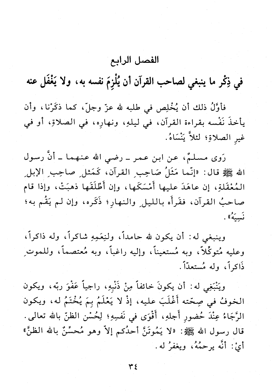 الفصل الرابع في ذكر ما ينبغي لصاحب القرآن أن يلزم نفسه به، ولا يغفل عنه