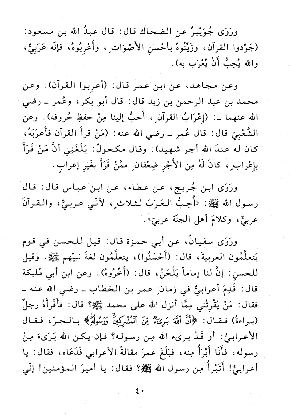 وروى سفيان، عن أبي حمزة قال: قيل للحسن في قوم يتعلّمون العربية، قال: (أحسنوا)، يتعلّمون لغة نبيّهم صلّى الله عليه وسلم. وقيل للحسن: إنّ لنا إماما يلحن، قال: (أخّروه). وعن ابن أبي مليكة قال: قدم أعرابيّ في زمان عمر بن الخطاب - رضي الله عنه - فقال: من يقرئني ممّا أنزل الله على محمد صلّى الله عليه وسلم؟ قال: فأقرأه رجل (براءة) فقال: أَنَّ اللَّهَ بَرِيءٌ مِنَ الْمُشْرِكِينَ وَرَسُولُهُ بالجرّ، فقال الأعرابيّ: أو قد برىء الله من رسوله؟ فإن يكن الله برىء من رسوله، فأنا أبرأ منه، فبلغ عمر مقالة الأعرابي فدعاه، فقال: يا أعرابيّ! أتبرأ من رسول الله صلّى الله عليه وسلم؟ فقال: يا أمير المؤمنين! إنّي