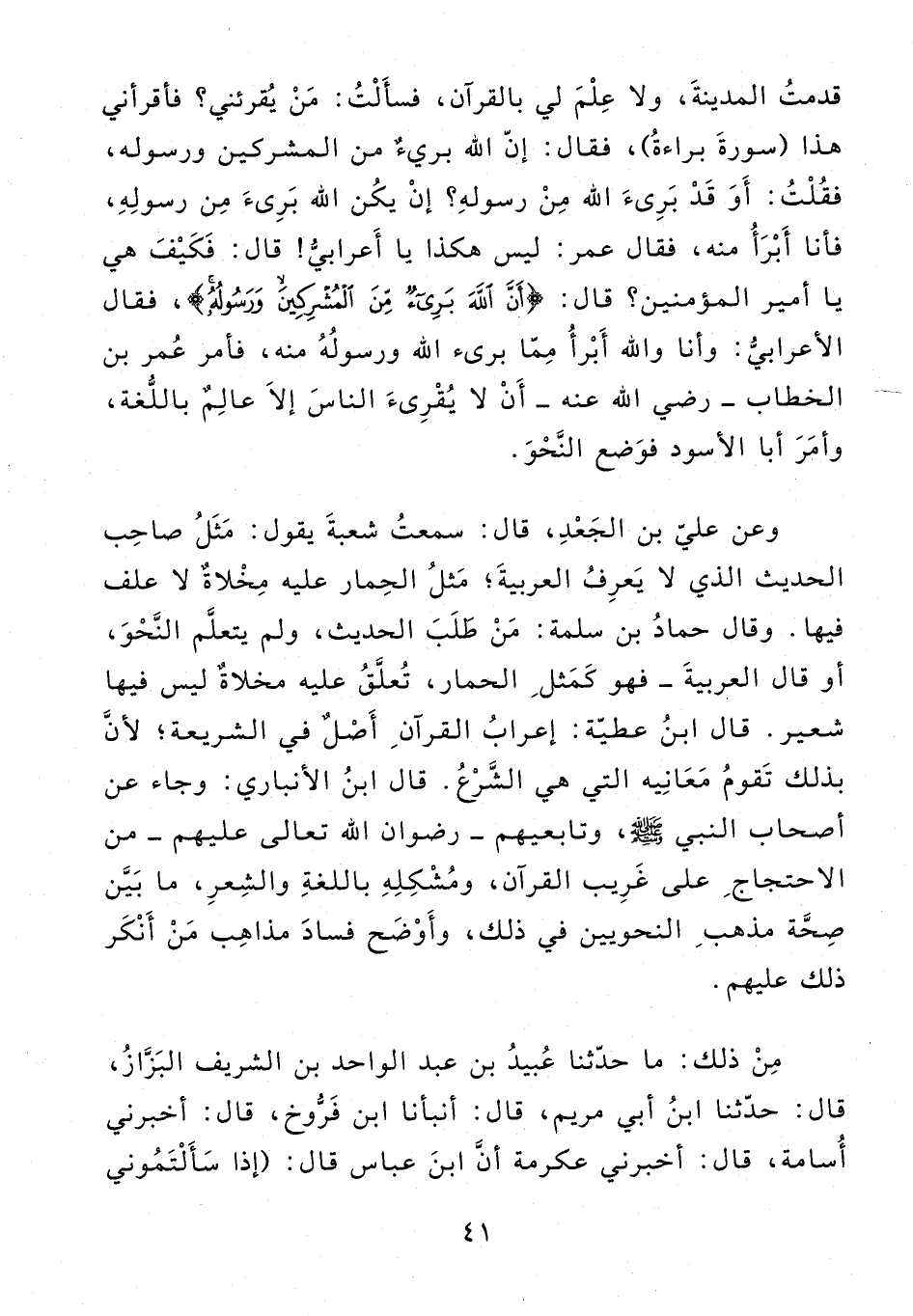 وعن عليّ بن الجعد، قال: سمعت شعبة يقول: مثل صاحب الحديث الذي لا يعرف العربية؛ مثل الحمار عليه مخلاة لا علف فيها. وقال حماد بن سلمة: من طلب الحديث، ولم يتعلّم النّحو، أو قال العربية - فهو كمثل الحمار، تعلّق عليه مخلاة ليس فيها شعير. قال ابن عطيّة: إعراب القرآن أصل في الشريعة؛ لأنّ بذلك تقوم معانيه التي هي الشّرع. قال ابن الأنباري: وجاء عن أصحاب النبي صلّى الله عليه وسلم، وتابعيهم - رضوان الله تعالى عليهم - من الاحتجاج على غريب القرآن، ومشكله باللغة والشعر، ما بيّن صحّة مذهب النحويين في ذلك، وأوضح فساد مذاهب من أنكر ذلك عليهم.