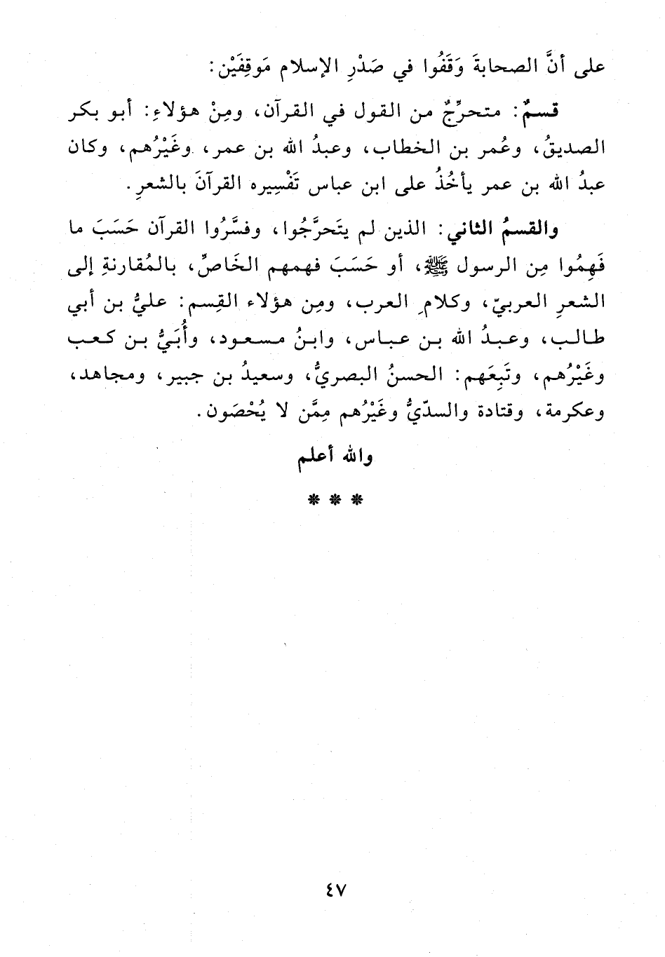 قسم: متحرّج من القول في القرآن، ومن هؤلاء: أبو بكر الصديق، وعمر بن الخطاب، وعبد الله بن عمر، وغيرهم، وكان عبد الله بن عمر يأخذ على ابن عباس تفسيره القرآن بالشعر.