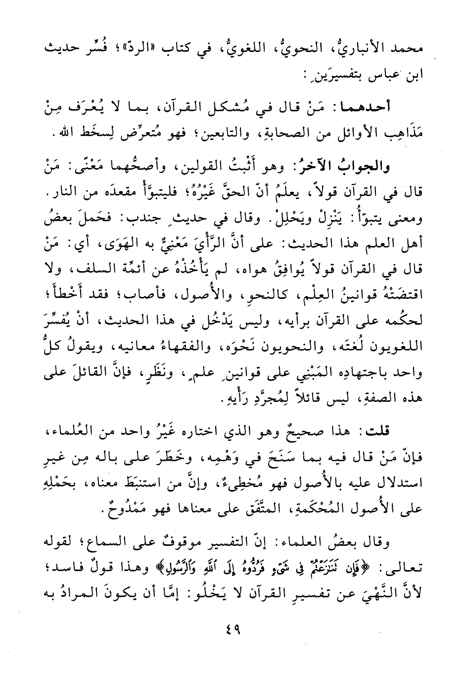 قلت: هذا صحيح وهو الذي اختاره غير واحد من العلماء، فإنّ من قال فيه بما سنح في وهمه، وخطر على باله من غير استدلال عليه بالأصول فهو مخطىء، وإنّ من استنبط معناه، بحمله على الأصول المحكمة، المتّفق على معناها فهو ممدوح.