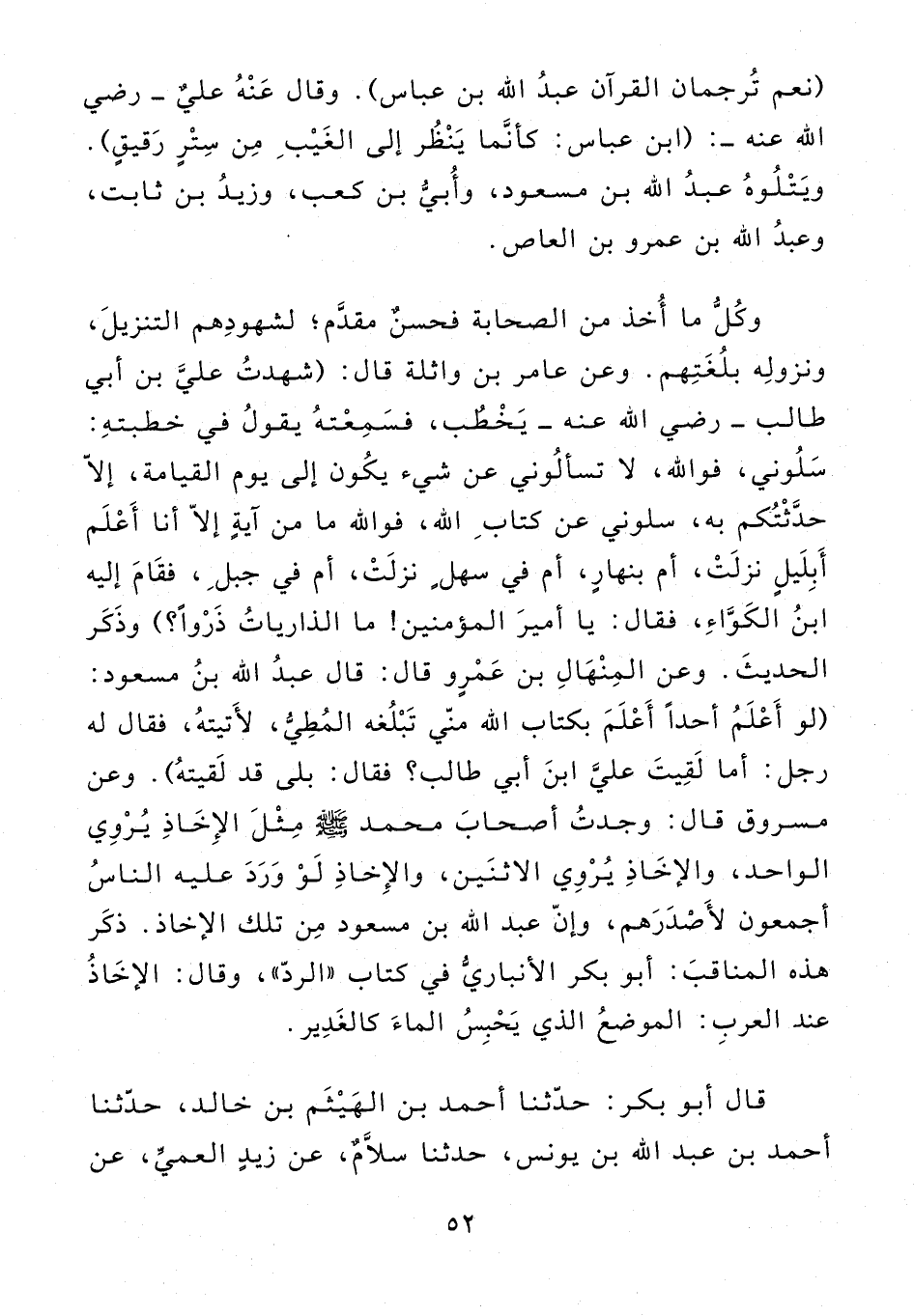(لو أعلم أحدا أعلم بكتاب الله منّي تبلغه المطيّ، لأتيته، فقال له رجل: أما لقيت عليّ ابن أبي طالب؟ فقال: بلى قد لقيته). وعن مسروق قال: وجدت أصحاب محمد صلّى الله عليه وسلم مثل الإخاذ يروي الواحد، والإخاذ يروي الاثنين، والإخاذ لو ورد عليه الناس أجمعون لأصدرهم، وإنّ عبد الله بن مسعود من تلك الإخاذ. ذكر هذه المناقب: أبو بكر الأنباريّ في كتاب «الردّ»، وقال: الإخاذ عند العرب: الموضع الذي يحبس الماء كالغدير.
