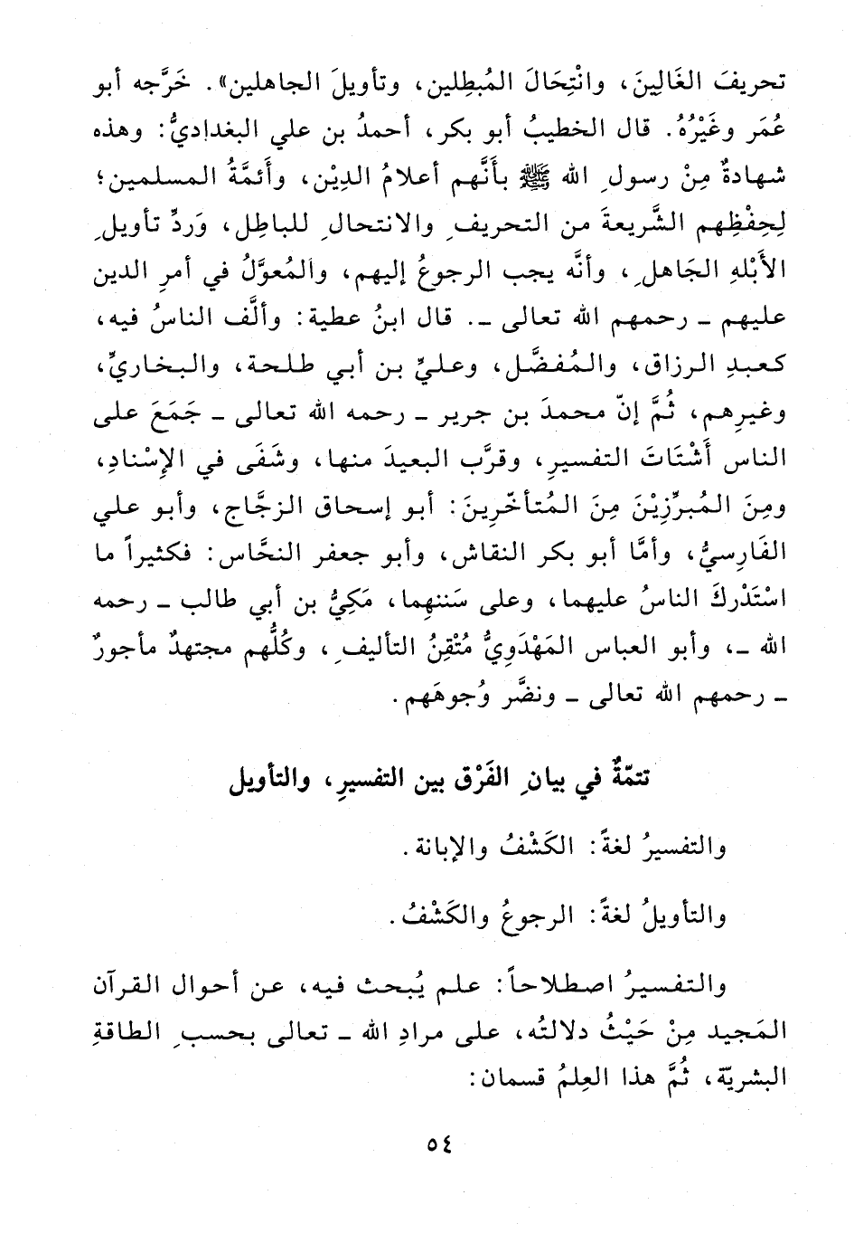 تحريف الغالين، وانتحال المبطلين، وتأويل الجاهلين». خرّجه أبو عمر وغيره. قال الخطيب أبو بكر، أحمد بن علي البغداديّ: وهذه شهادة من رسول الله صلّى الله عليه وسلم بأنّهم أعلام الدين، وأئمّة المسلمين؛ لحفظهم الشّريعة من التحريف والانتحال للباطل، وردّ تأويل الأبله الجاهل، وأنّه يجب الرجوع إليهم، والمعوّل في أمر الدين عليهم - رحمهم الله تعالى -. قال ابن عطية: وألّف الناس فيه، كعبد الرزاق، والمفضّل، وعليّ بن أبي طلحة، والبخاريّ، وغيرهم، ثمّ إنّ محمد بن جرير - رحمه الله تعالى - جمع على الناس أشتات التفسير، وقرّب البعيد منها، وشفى في الإسناد، ومن المبرّزين من المتأخّرين: أبو إسحاق الزجّاج، وأبو علي الفارسيّ، وأمّا أبو بكر النقاش، وأبو جعفر النحّاس: فكثيرا ما استدرك الناس عليهما، وعلى سننهما، مكيّ بن أبي طالب - رحمه الله -، وأبو العباس المهدويّ متقن التأليف، وكلّهم مجتهد مأجور - رحمهم الله تعالى - ونضّر وجوههم.