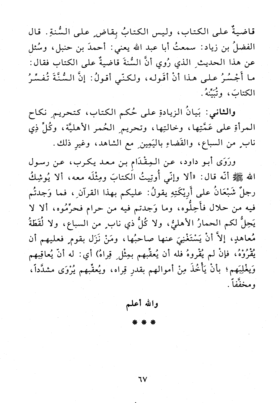 قاضية على الكتاب، وليس الكتاب بقاض على السّنة. قال الفضل بن زياد: سمعت أبا عبد الله يعني: أحمد بن حنبل، وسئل عن هذا الحديث الذي روي أنّ السّنة قاضية على الكتاب فقال: ما أجسر على هذا أن أقوله، ولكنّي أقول: إنّ السّنّة تفسّر الكتاب، وتبيّنه.