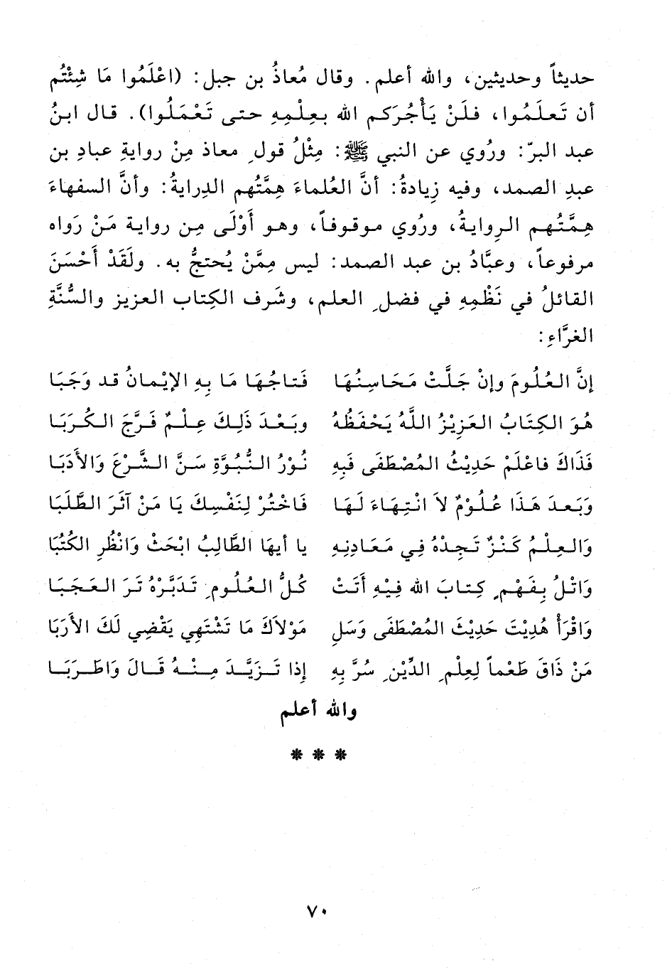 حديثا وحديثين، والله أعلم. وقال معاذ بن جبل: (اعلموا ما شئتم أن تعلموا، فلن يأجركم الله بعلمه حتى تعملوا). قال ابن عبد البرّ: وروي عن النبي صلّى الله عليه وسلم: مثل قول معاذ من رواية عباد بن عبد الصمد، وفيه زيادة: أنّ العلماء همّتهم الدراية: وأنّ السفهاء همّتهم الرواية، وروي موقوفا، وهو أولى من رواية من رواه مرفوعا، وعبّاد بن عبد الصمد: ليس ممّن يحتجّ به. ولقد أحسن القائل في نظمه في فضل العلم، وشرف الكتاب العزيز والسّنّة الغرّاء: