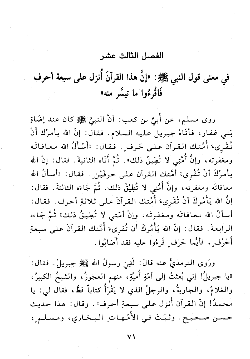 الفصل الثالث عشر في معنى قول النبي صلّى الله عليه وسلم: «إنّ هذا القرآن أنزل على سبعة أحرف فاقرءوا ما تيسّر منه»