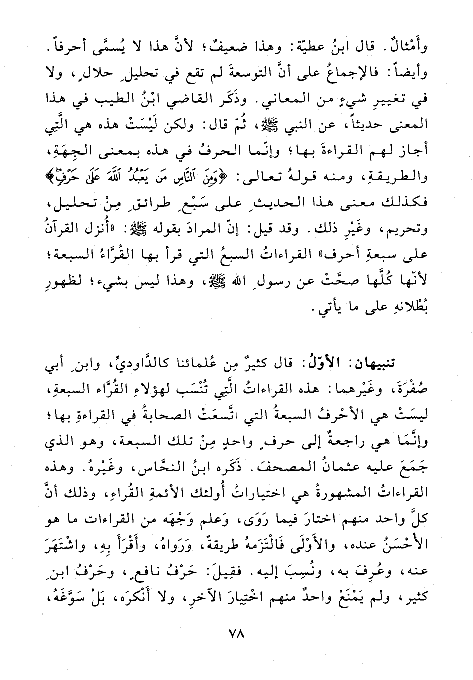 وأمثال. قال ابن عطيّة: وهذا ضعيف؛ لأنّ هذا لا يسمّى أحرفا. وأيضا: فالإجماع على أنّ التوسعة لم تقع في تحليل حلال، ولا في تغيير شيء من المعاني. وذكر القاضي ابن الطيب في هذا المعنى حديثا، عن النبي صلّى الله عليه وسلم، ثمّ قال: ولكن ليست هذه هي الّتي أجاز لهم القراءة بها؛ وإنّما الحرف في هذه بمعنى الجهة، والطريقة، ومنه قوله تعالى: {وَمِنَ النَّاسِ مَنْ يَعْبُدُ اللَّهَ عَلى حَرْفٍ} فكذلك معنى هذا الحديث على سبع طرائق من تحليل، وتحريم، وغير ذلك. وقد قيل: إنّ المراد بقوله صلّى الله عليه وسلم: «أنزل القرآن على سبعة أحرف» القراءات السبع التي قرأ بها القرّاء السبعة؛ لأنّها كلّها صحّت عن رسول الله صلّى الله عليه وسلم، وهذا ليس بشيء؛ لظهور بطلانه على ما يأتي.