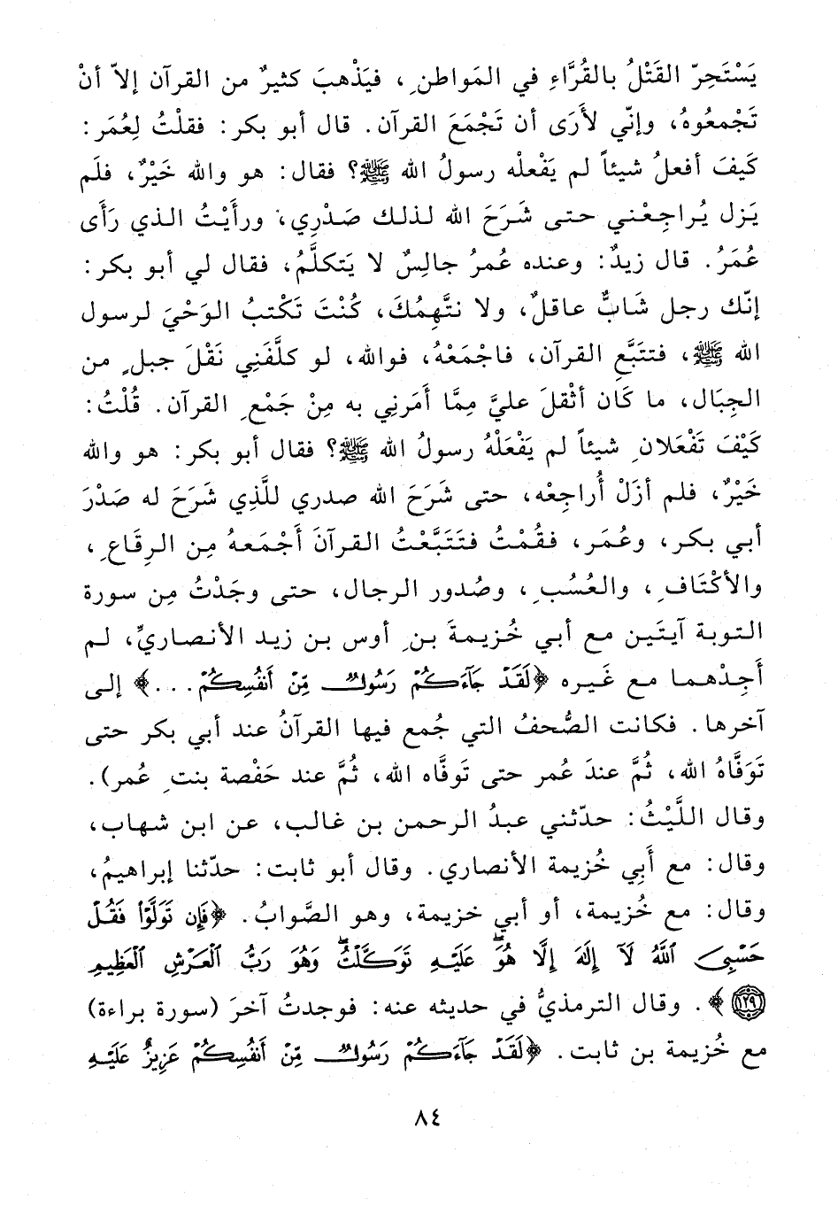 يستحرّ القتل بالقرّاء في المواطن، فيذهب كثير من القرآن إلّا أن تجمعوه، وإنّي لأرى أن تجمع القرآن. قال أبو بكر: فقلت لعمر: كيف أفعل شيئا لم يفعله رسول الله صلّى الله عليه وسلم؟ فقال: هو والله خير، فلم يزل يراجعني حتى شرح الله لذلك صدري، ورأيت الذي رأى عمر. قال زيد: وعنده عمر جالس لا يتكلّم، فقال لي أبو بكر: إنّك رجل شابّ عاقل، ولا نتّهمك، كنت تكتب الوحي لرسول الله صلّى الله عليه وسلم، فتتبّع القرآن، فاجمعه، فو الله، لو كلّفني نقل جبل من الجبال، ما كان أثقل عليّ ممّا أمرني به من جمع القرآن. قلت: كيف تفعلان شيئا لم يفعله رسول الله صلّى الله عليه وسلم؟ فقال أبو بكر: هو والله خير، فلم أزل أراجعه، حتى شرح الله صدري للّذي شرح له صدر أبي بكر، وعمر، فقمت فتتبّعت القرآن أجمعه من الرقاع، والأكتاف، والعسب، وصدور الرجال، حتى وجدت من سورة التوبة آيتين مع أبي خزيمة بن أوس بن زيد الأنصاريّ، لم أجدهما مع غيره {لَقَدْ جاءَكُمْ رَسُولٌ مِنْ أَنْفُسِكُمْ ...} إلى آخرها. فكانت الصّحف التي جمع فيها القرآن عند أبي بكر حتى توفّاه الله، ثمّ عند عمر حتى توفّاه الله، ثمّ عند حفصة بنت عمر).