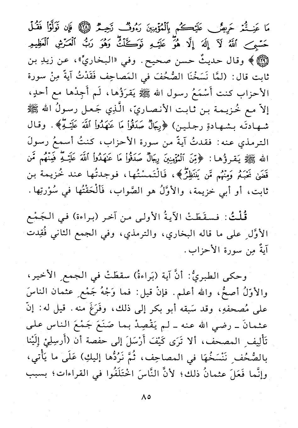 ما عَنِتُّمْ حَرِيصٌ عَلَيْكُمْ بِالْمُؤْمِنِينَ رَؤُفٌ رَحِيمٌ (128) فَإِنْ تَوَلَّوْا فَقُلْ حَسْبِيَ اللَّهُ لا إِلهَ إِلَّا هُوَ عَلَيْهِ تَوَكَّلْتُ وَهُوَ رَبُّ الْعَرْشِ الْعَظِيمِ (129)} وقال حديث حسن صحيح. وفي «البخاريّ»، عن زيد بن ثابت قال: (لمّا نسخنا الصّحف في المصاحف فقدت آية من سورة الأحزاب كنت أسمع رسول الله صلّى الله عليه وسلم يقرؤها، لم أجدها مع أحد، إلّا مع خزيمة بن ثابت الأنصاريّ، الّذي جعل رسول الله صلّى الله عليه وسلم شهادته بشهادة رجلين) {رِجالٌ صَدَقُوا ما عاهَدُوا اللَّهَ عَلَيْهِ}. وقال الترمذي عنه: فقدت آية من سورة الأحزاب، كنت أسمع رسول الله صلّى الله عليه وسلم يقرؤها: {مِنَ الْمُؤْمِنِينَ رِجالٌ صَدَقُوا ما عاهَدُوا اللَّهَ عَلَيْهِ فَمِنْهُمْ مَنْ قَضى نَحْبَهُ وَمِنْهُمْ مَنْ يَنْتَظِرُ}، فالتمستها، فوجدتها عند خزيمة بن ثابت، أو أبي خزيمة، والأوّل هو الصّواب، فألحقتها في سورتها.