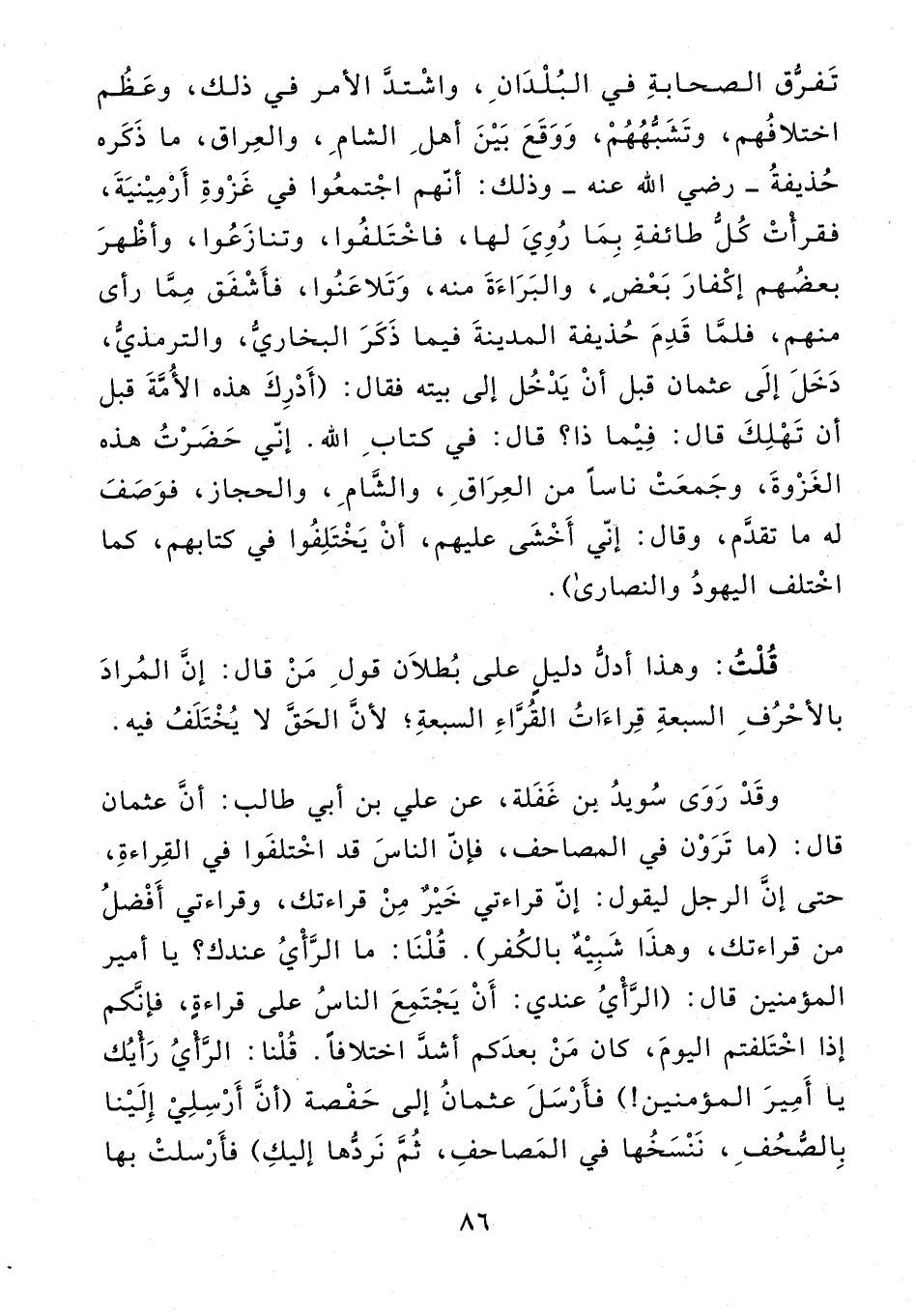 وقد روى سويد بن غفلة، عن علي بن أبي طالب: أنّ عثمان قال: (ما ترون في المصاحف، فإنّ الناس قد اختلفوا في القراءة، حتى إنّ الرجل ليقول: إنّ قراءتي خير من قراءتك، وقراءتي أفضل من قراءتك، وهذا شبيه بالكفر). قلنا: ما الرّأي عندك؟ يا أمير المؤمنين قال: (الرّأي عندي: أن يجتمع الناس على قراءة، فإنّكم إذا اختلفتم اليوم، كان من بعدكم أشدّ اختلافا. قلنا: الرّأي رأيك يا أمير المؤمنين!) فأرسل عثمان إلى حفصة (أنّ أرسلي إلينا بالصّحف، ننسخها في المصاحف، ثمّ نردّها إليك) فأرسلت بها