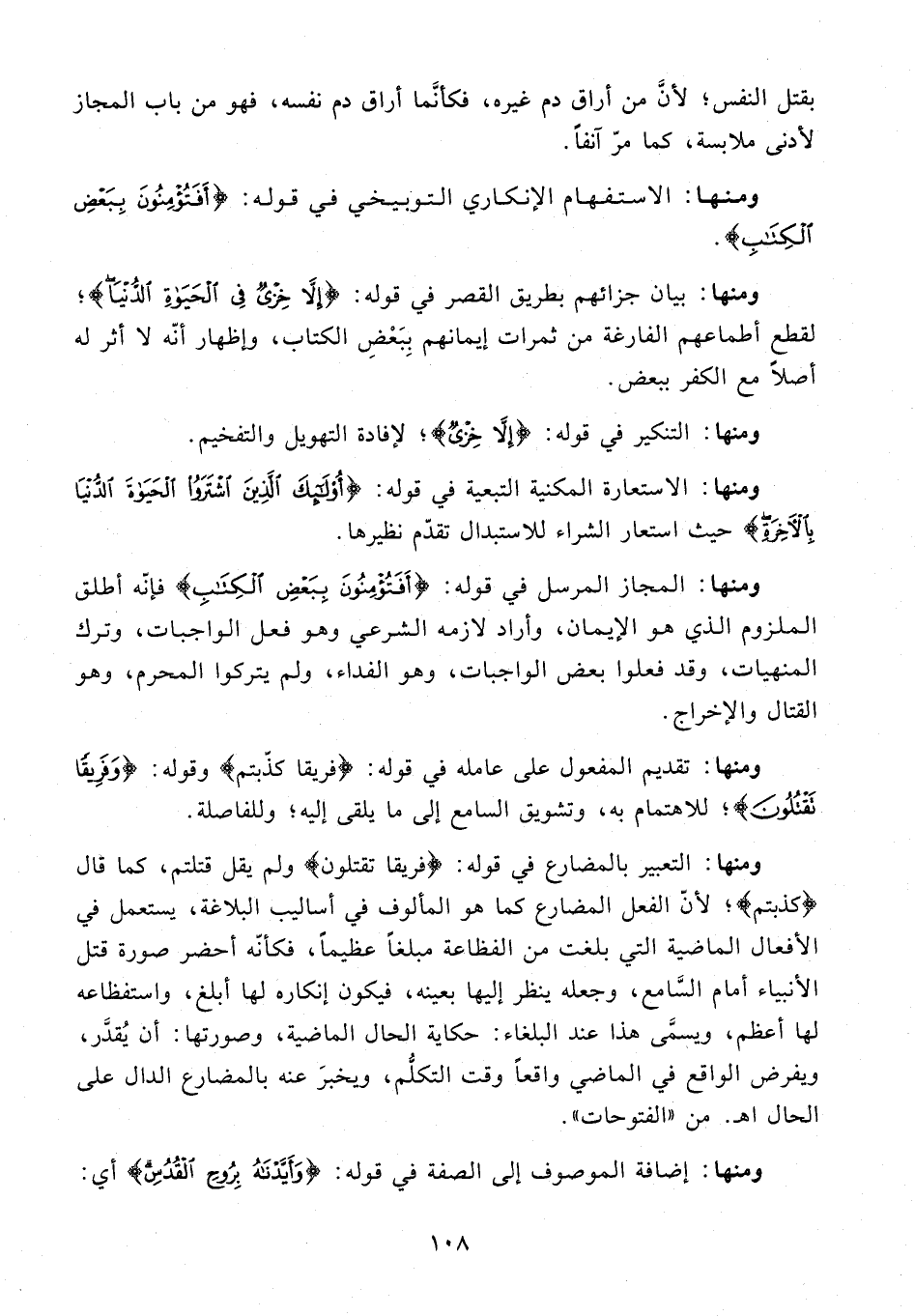 ومنها: المجاز المرسل في قوله: {أَفَتُؤْمِنُونَ بِبَعْضِ الْكِتَابِ} فإنّه أطلق الملزوم الذي هو الإيمان، وأراد لازمه الشرعي وهو فعل الواجبات، وترك المنهيات، وقد فعلوا بعض الواجبات، وهو الفداء، ولم يتركوا المحرم، وهو القتال والإخراج.